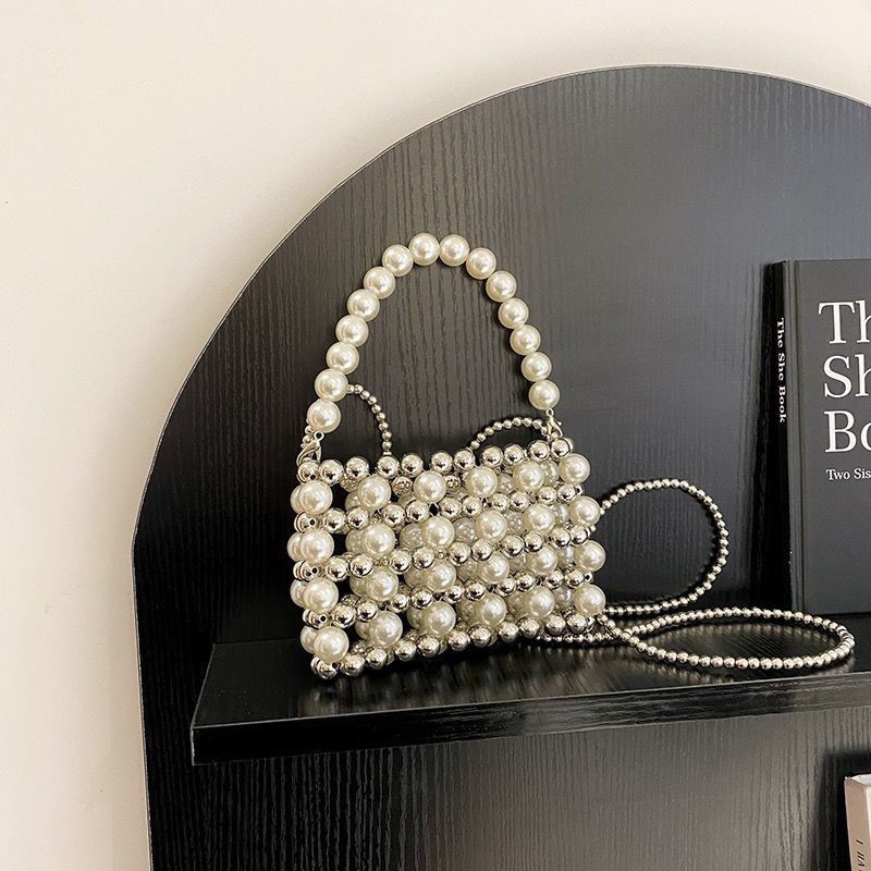 Xiaozhong 실버 구슬 수제 구슬 휴대용 미니 가방 금속 체인 크로스 바디 여성용 가방 올 매치 짠 가방 인터넷 축하