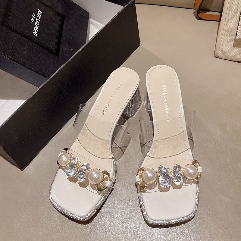 진주 라인석 슬리퍼 여성 신발 겉옷 2024 여름 투명 하이힐 두꺼운 미드 힐 오픈 발가락 샌들