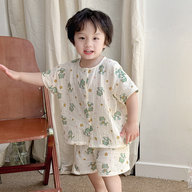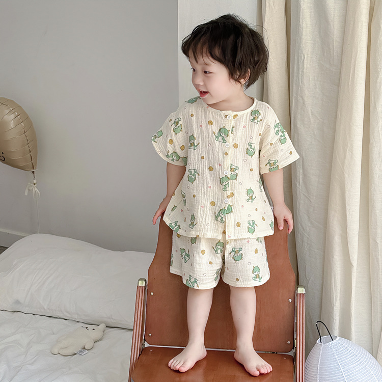 한국식 어린이 잠옷 세트 순면 얇은 아기 면 원사 홈 옷 숨 쉬는 짧은 소매 에어컨 소년 소녀 용 옷