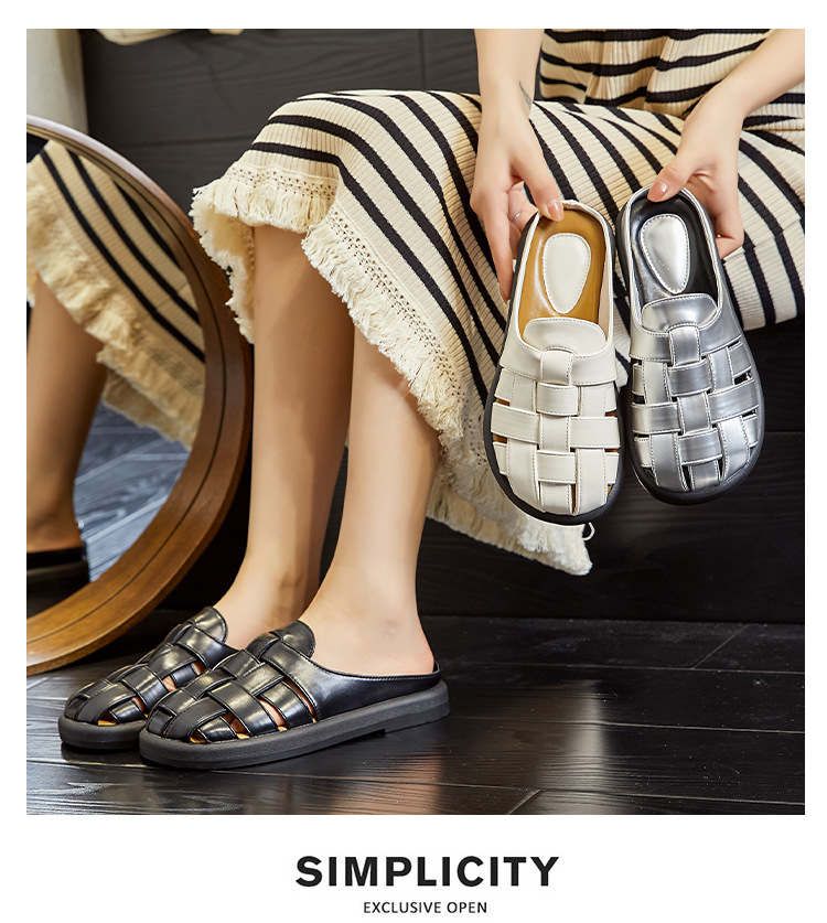 2025 새로운 여름 복고풍 짠 슬리퍼 중공 통기성 플랫 샌들 Baotou 외부 착용 하프 슬리퍼 패션 여성 신발