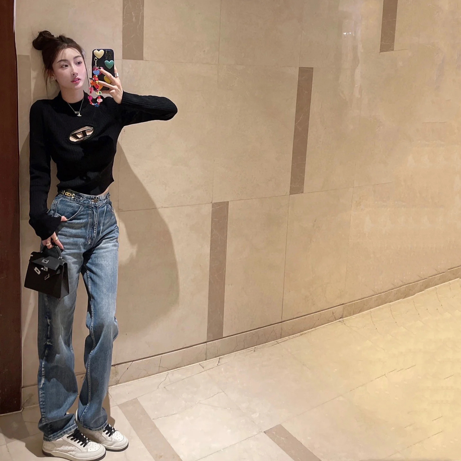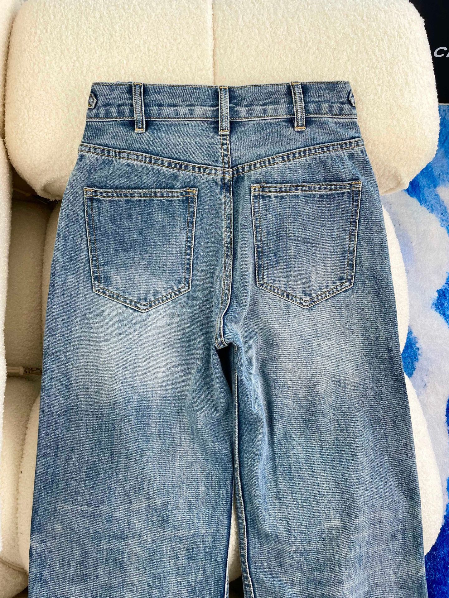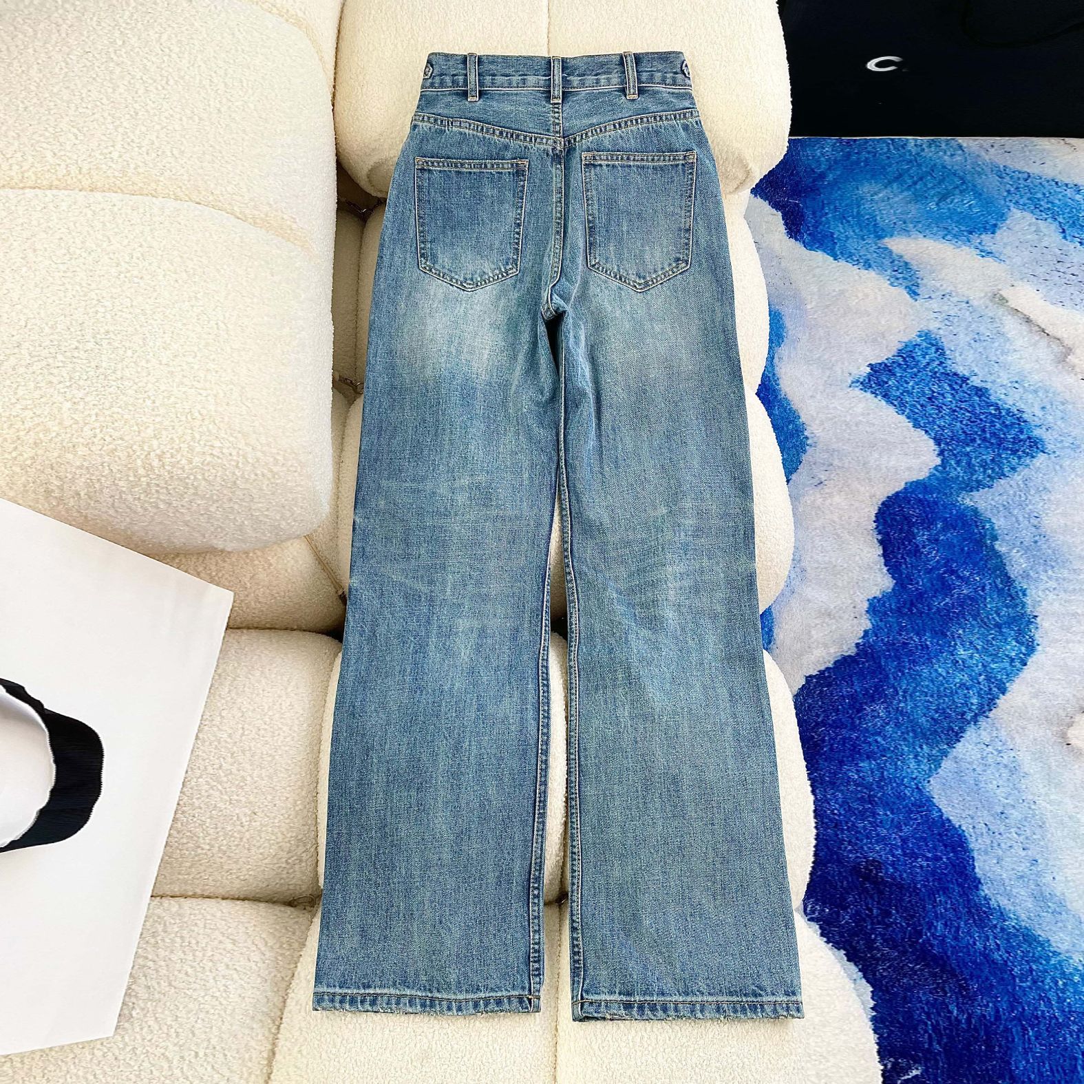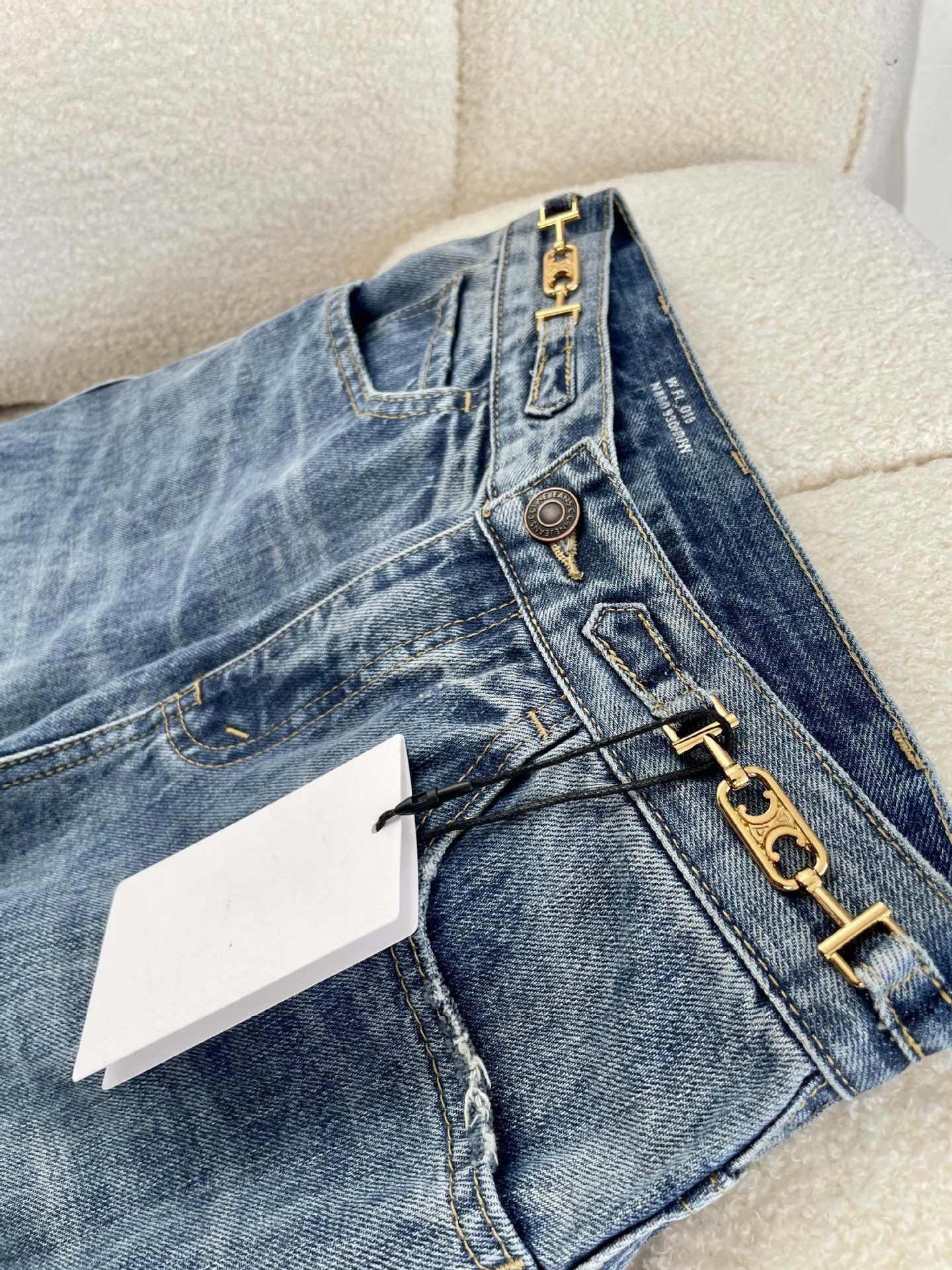 2025 여름 유럽산 남유 고급 여성복 CE 트라이엄프 아치 더블 버튼 허리 체인 하이웨이스트 스트레이트 와이드 레그 데님 팬츠 여성용스토어 가기