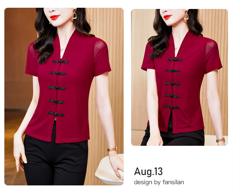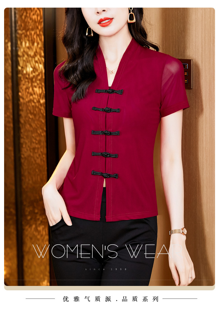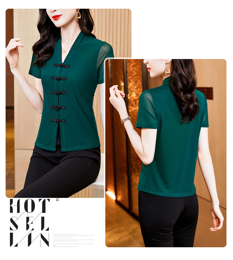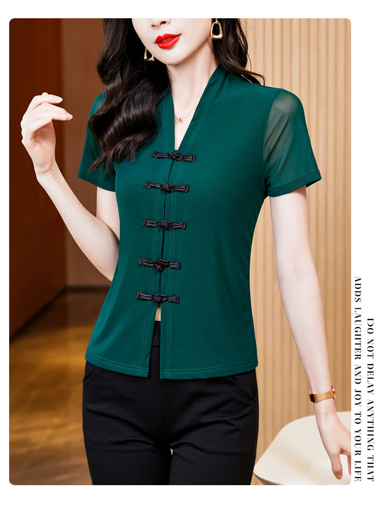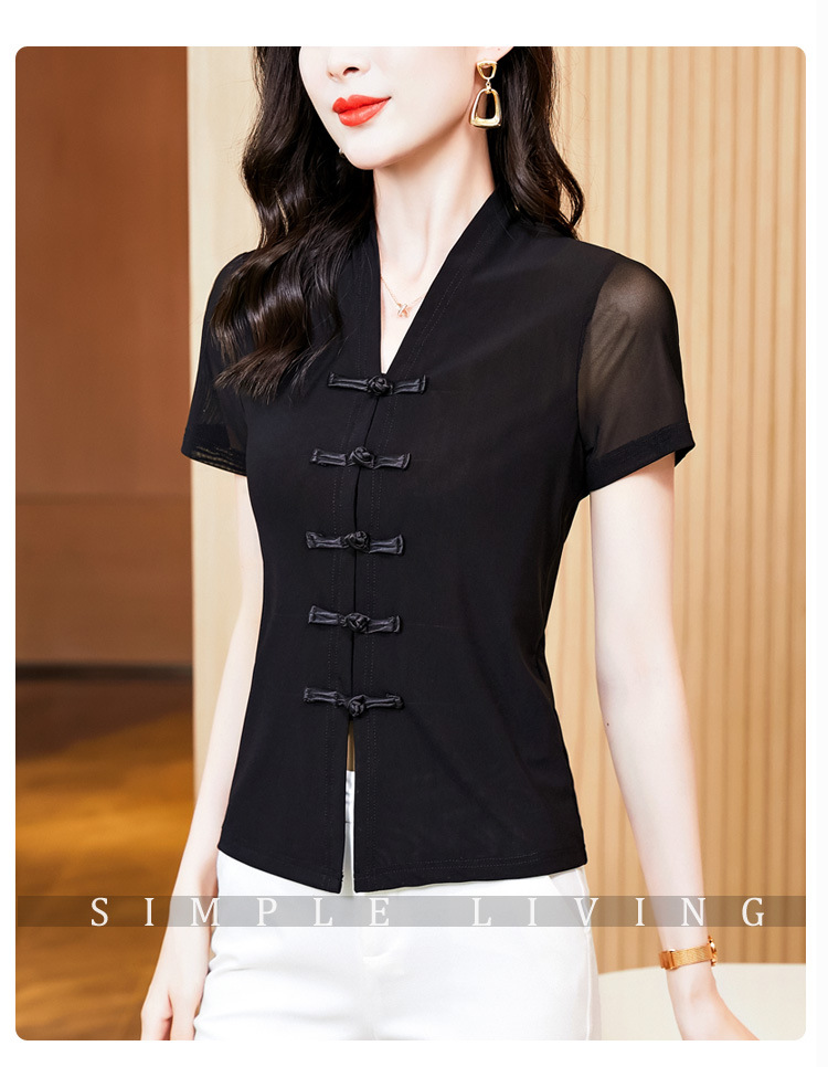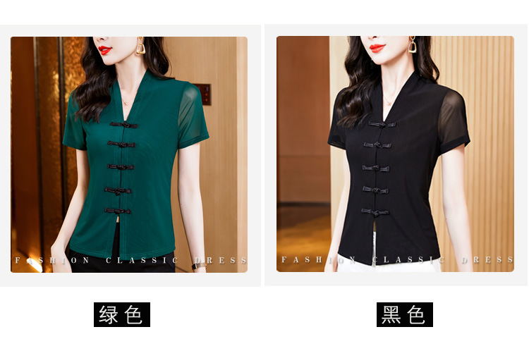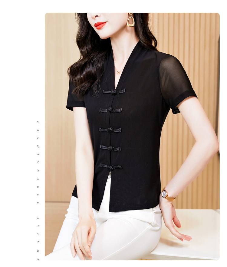 2024 여름 새로운 기질 조커 레트로 버클 단색 V 칼라 짧은 소매 메쉬베이스 셔츠 여성 도매스토어 가기