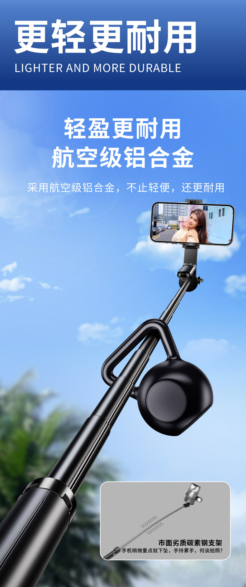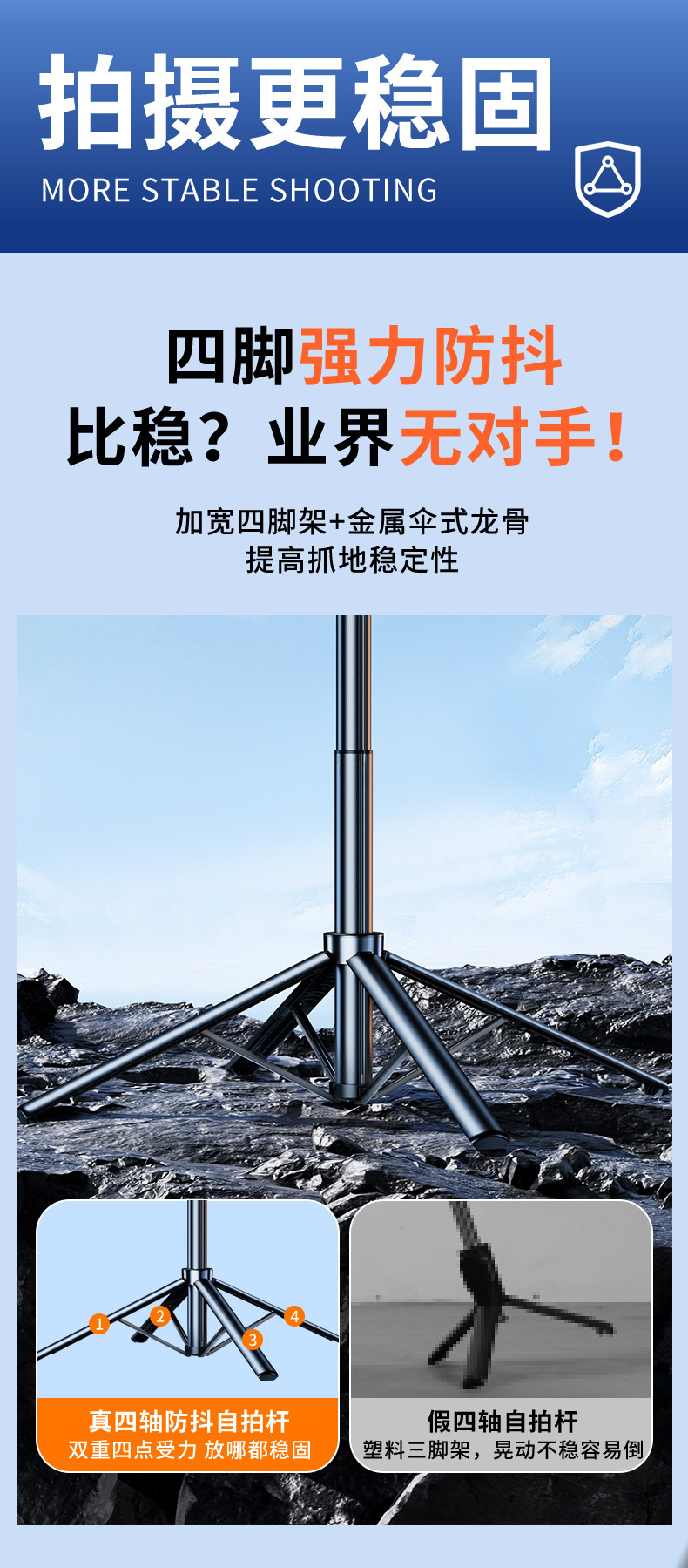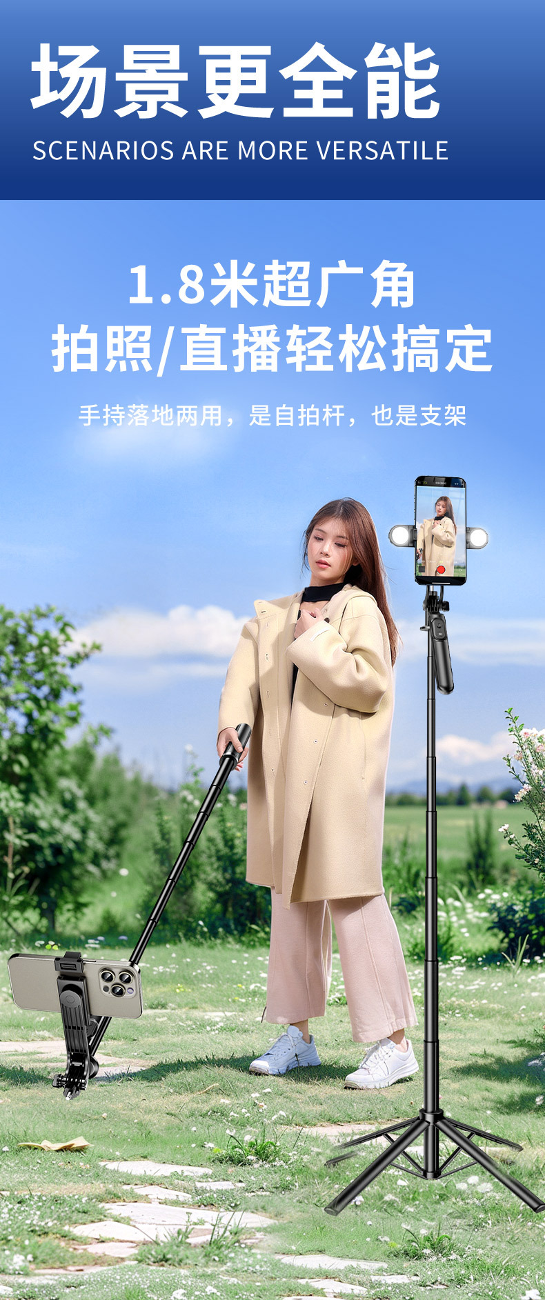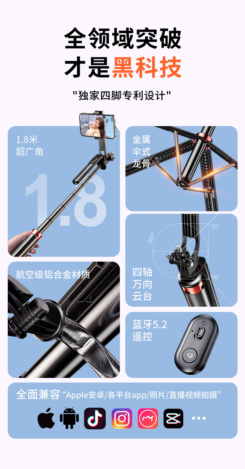• 1.8m [알루미늄 합금 + 단일 보조광] 4축 파노라마 손떨림 방지 및 안정적인 촬영 - 4각 안정성 업그레이드 - 20m 충전 리모컨