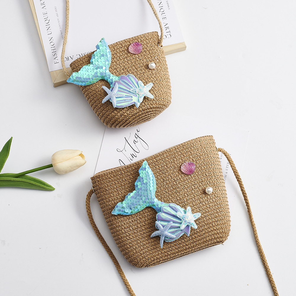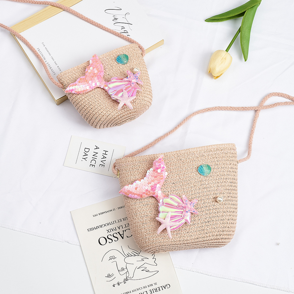 Ins 여름 인어 밀짚 작은 가방 소녀 크로스 바디 동전 지갑 미니 가방 소녀 귀여운 작은 사첼 휴대 전화스토어 가기