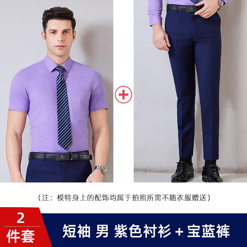 • 반팔 남성 보라색 셔츠 + 사파이어 블루 바지