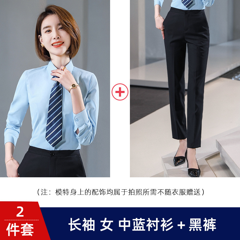 • 긴팔 여성용 블루 셔츠 + 블랙 바지