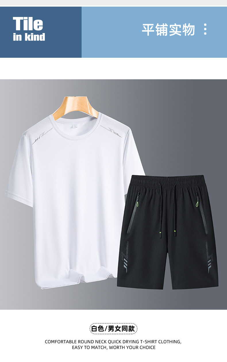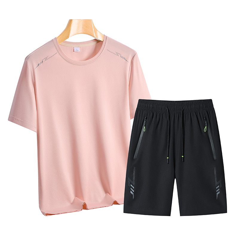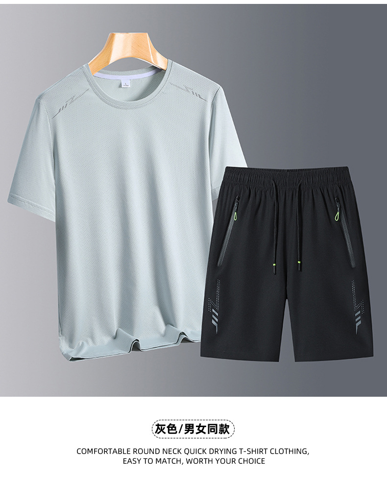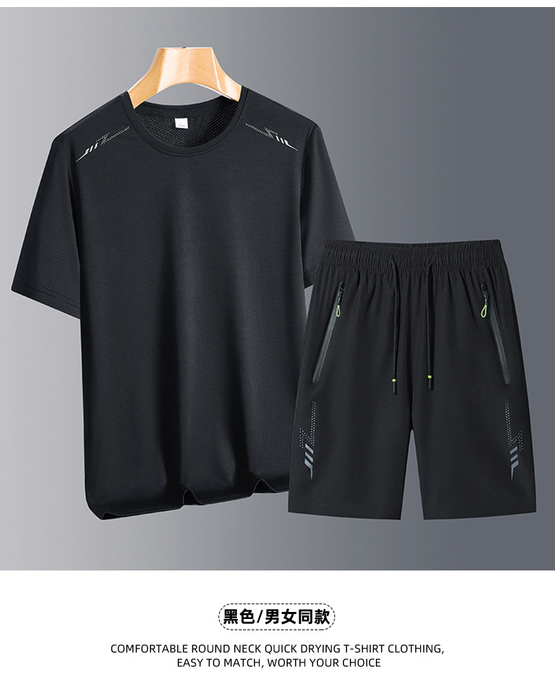 아이스 실크 스포츠 세트 남성 여름 달리기 빠른 건조 의류 느슨한 아이스 실크 통기성 캐주얼 의류 스트레치 피트니스 투피스 세트