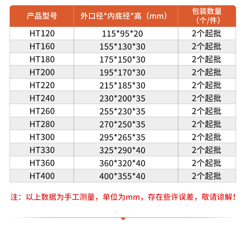 • HT120 (외경 115*내바닥 직경 95*높이 20mm) 최소 배치 크기는 2개입니다.