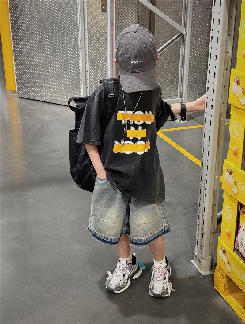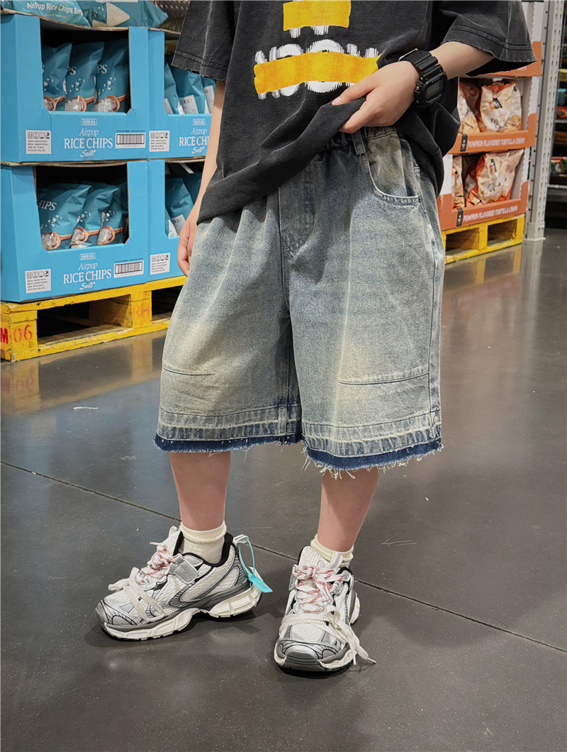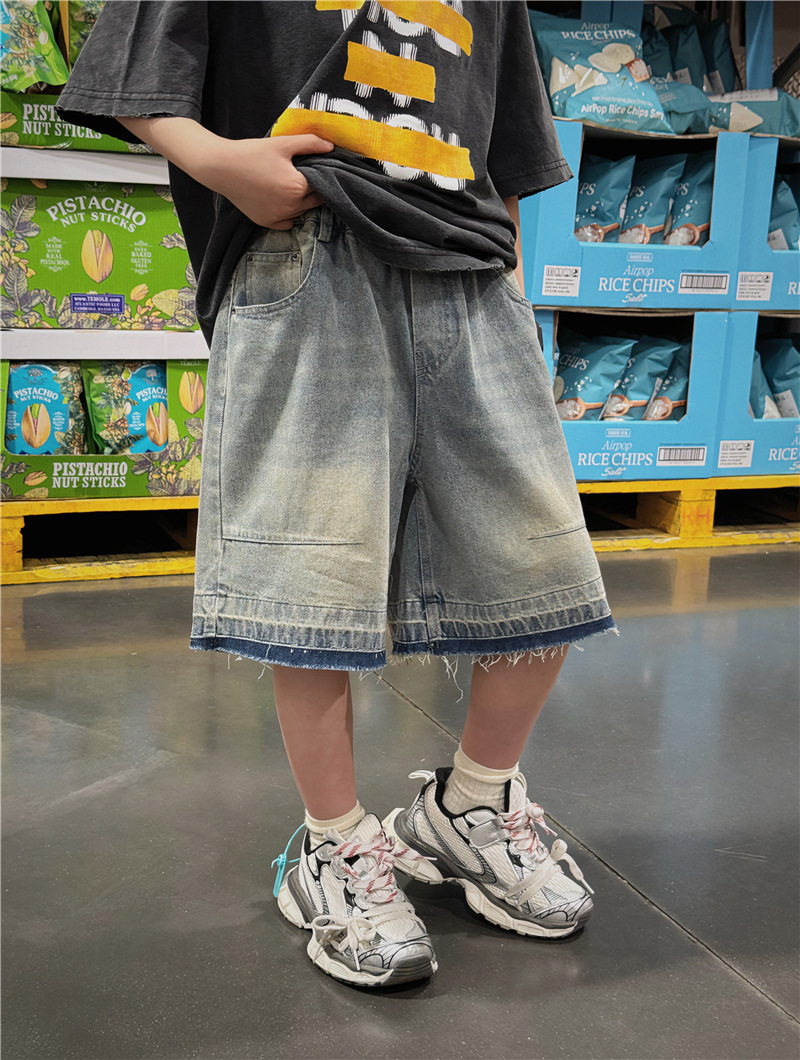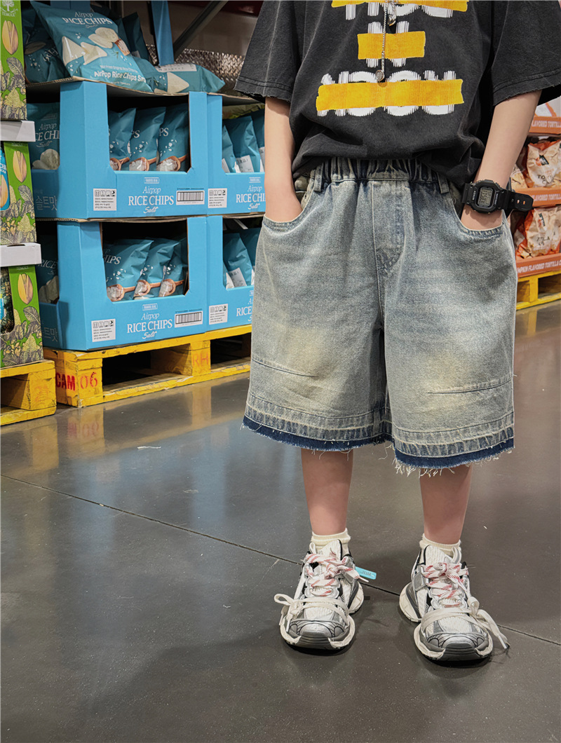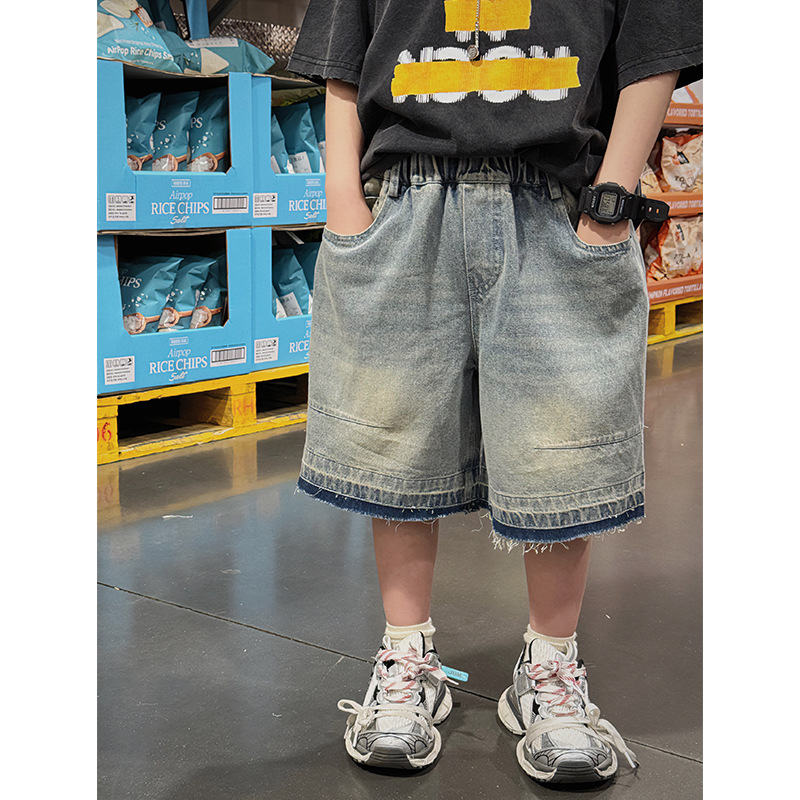 Baoduo 아동복 남학생 랩 데님 반바지 2024 새로운 도착 중 아이 바지 여름 얇은 바지 어린이 바지