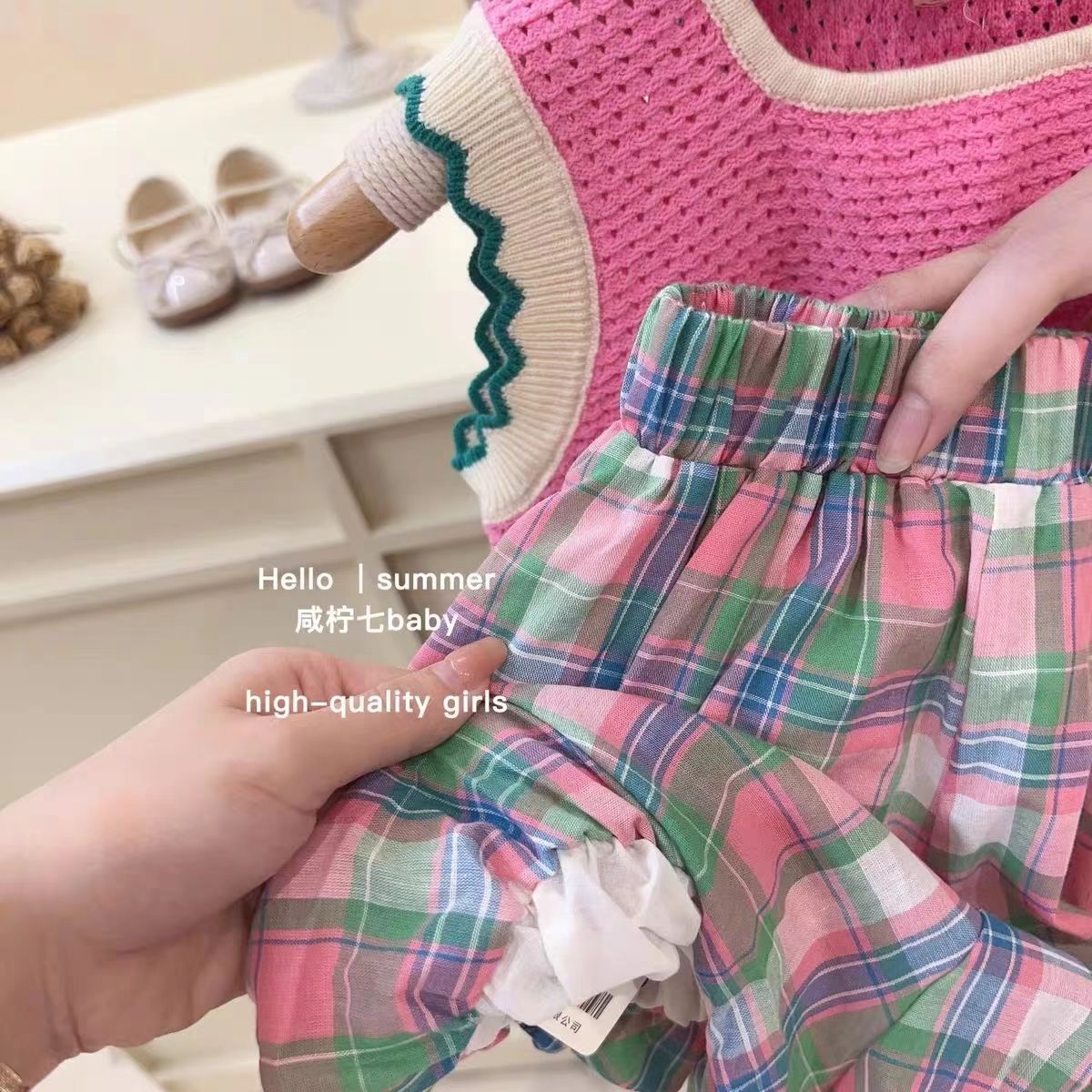 한국 여성 아동복 여름 유행 서양식 유행 아기 니트 조끼 격자 무늬 버드 반바지 투피스 세트스토어 가기
