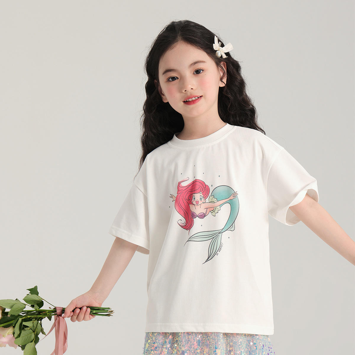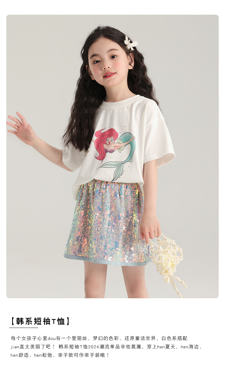 2024 년 여름 새 여학생 반팔 티셔츠 조커 인어 인쇄 반팔 정사이즈 걸스 티셔츠
