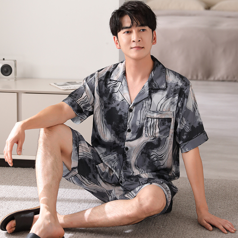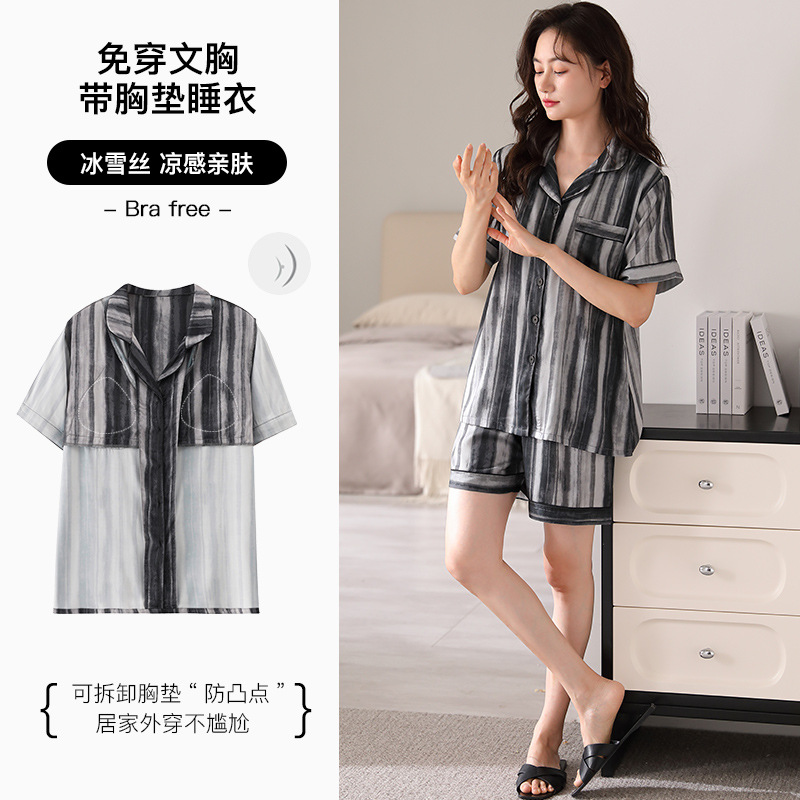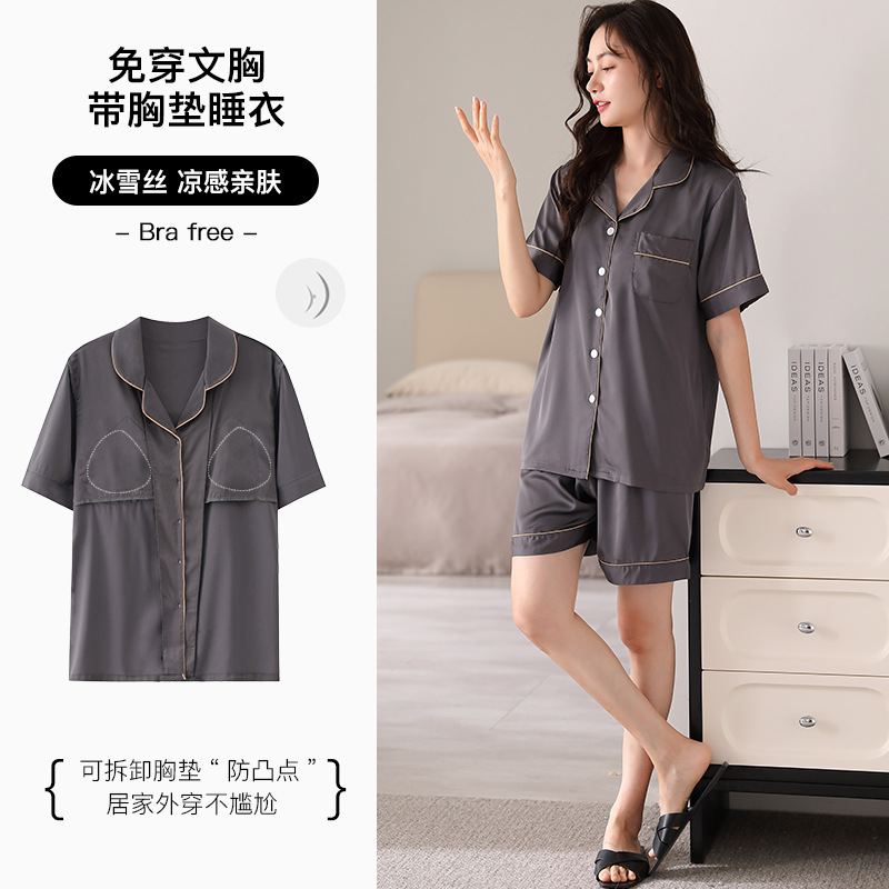 커플 아이스 실크 파자마 여름 여자 쿨 얇은 짧은 소매 반바지 가슴 패드 실크 남자 홈 의류 세트스토어 가기