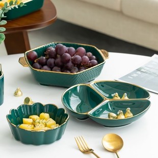 热卖北欧风金边陶瓷沙拉零食碗 墨绿双耳六角水果盘 轻奢家用餐具