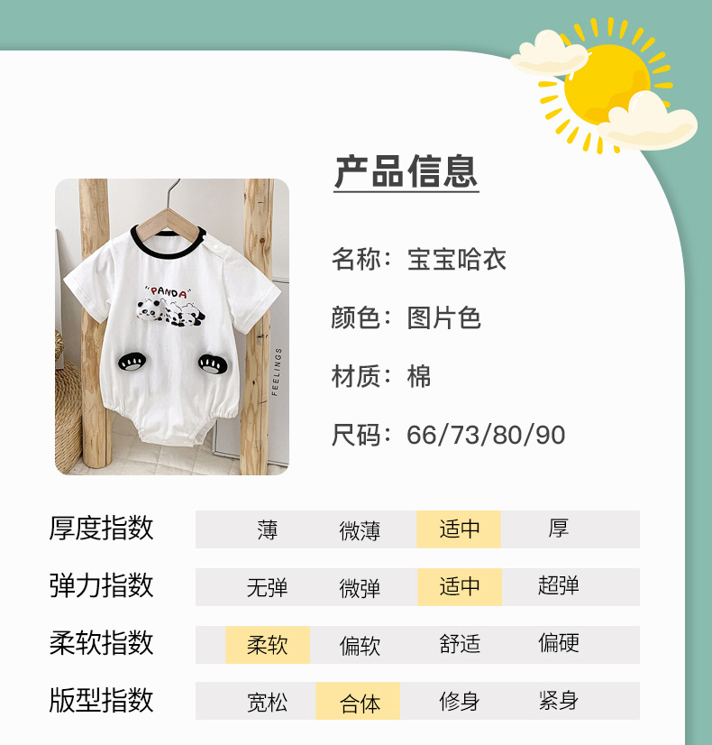 아기의 여름 옷 얇은 남자와 여자의 아기 만화 인쇄 팬더 삼각형 가방 방귀 옷 캐주얼 등반 옷