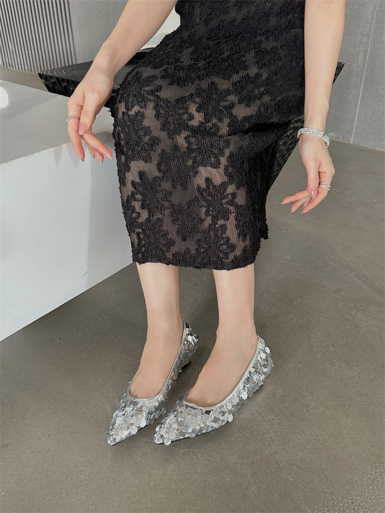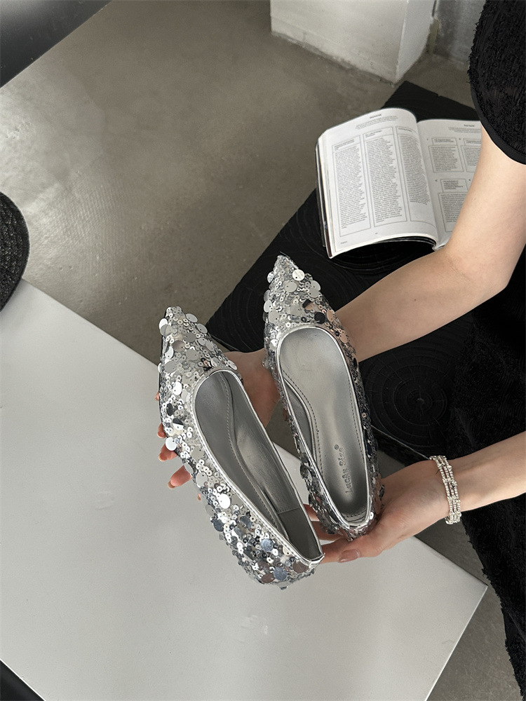 하이 엔드 스팽글 실버 신발 여성 로우 힐 플랫 신발 틈새 디자인 뾰족한 발가락 쐐기 2024 새로운 얕은 입