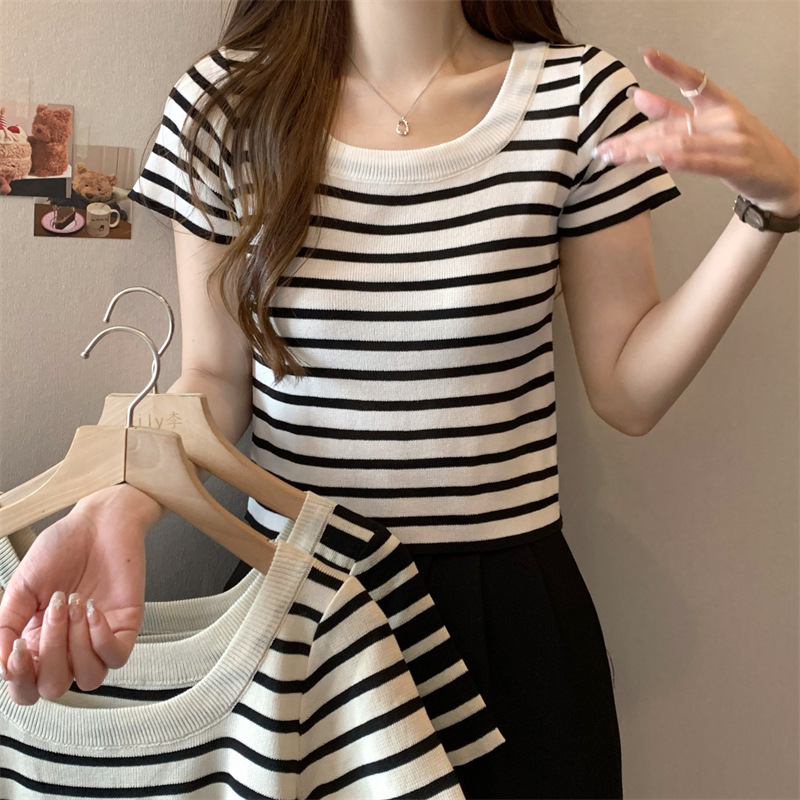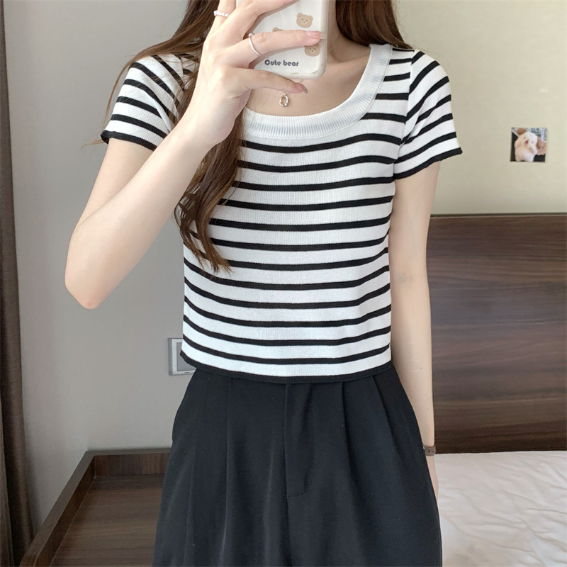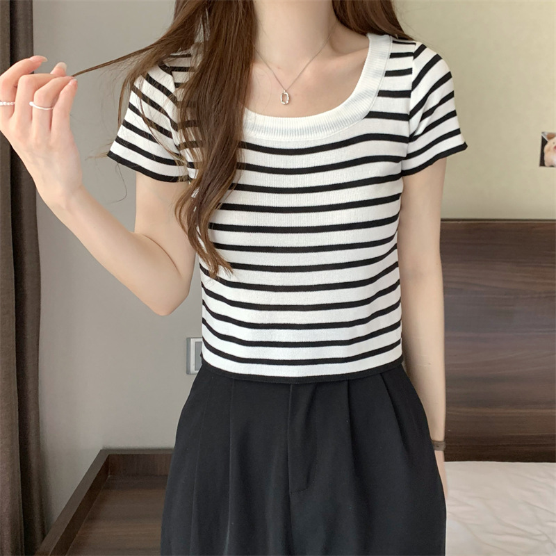 프랑스 대형 U-넥 블랙과 화이트 스트라이프 숄더 스퀘어 넥 반팔 티셔츠 여성용 2024 년 새 여름 틈새 쇼트 탑