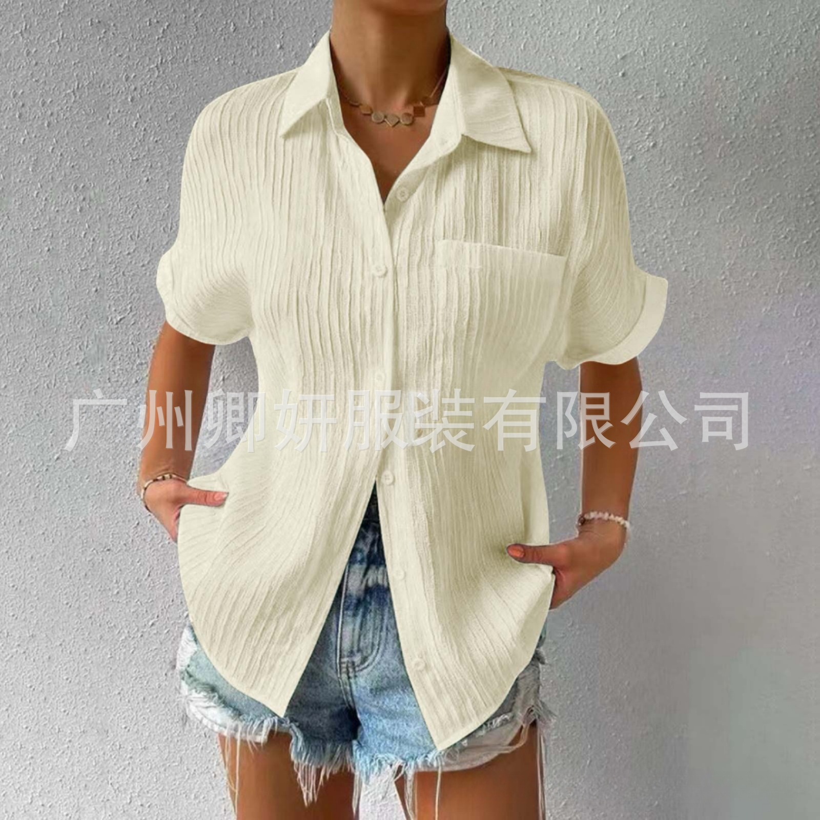 카디건 옷 2023 바느질 포켓 반팔 단색 우아한 캐주얼 옷깃 라글란 소매 셔츠 반팔 여성용 의류스토어 가기