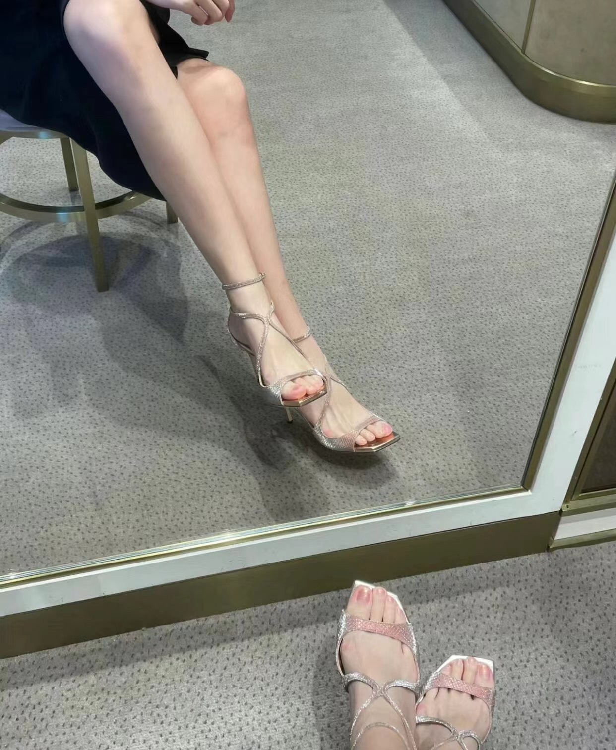 한 단어로 여자 섹시한 오픈 발가락 샌들 2024 여름 새로운 도착 크로스 스트랩 세퀸 스퀘어 발가락 패션 올매치 하이힐스토어 가기