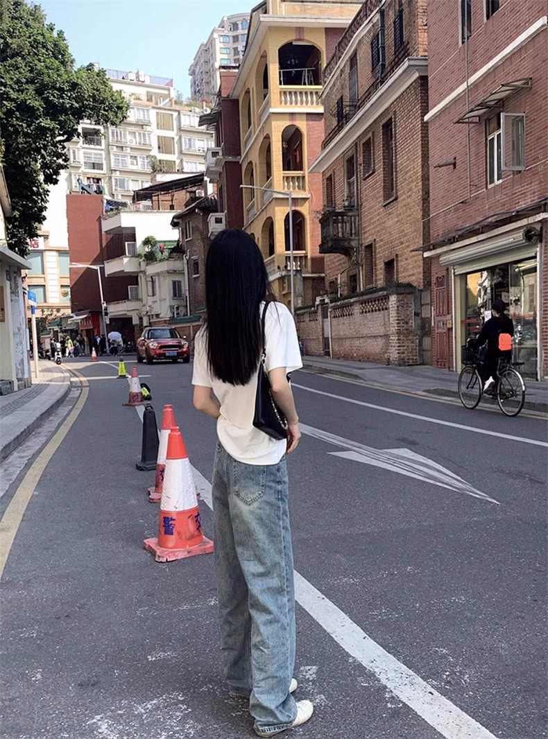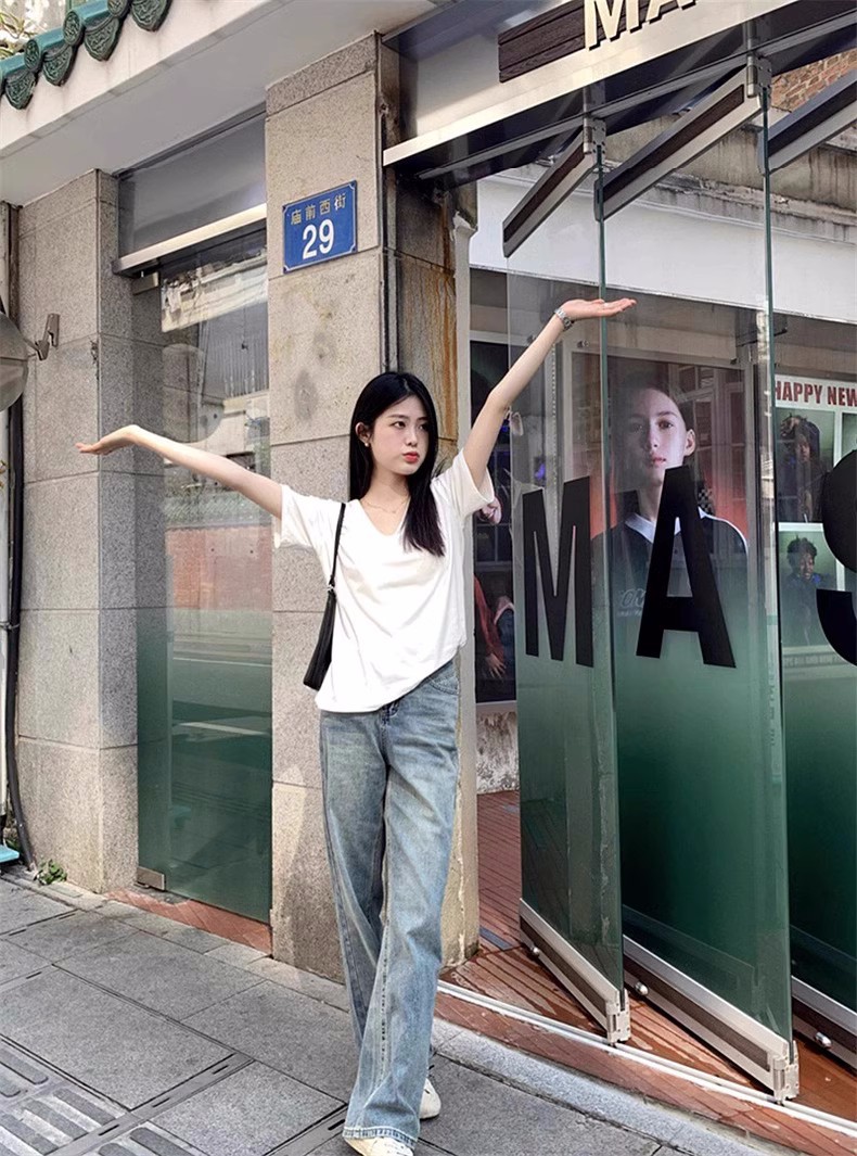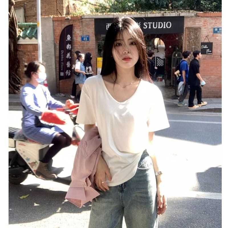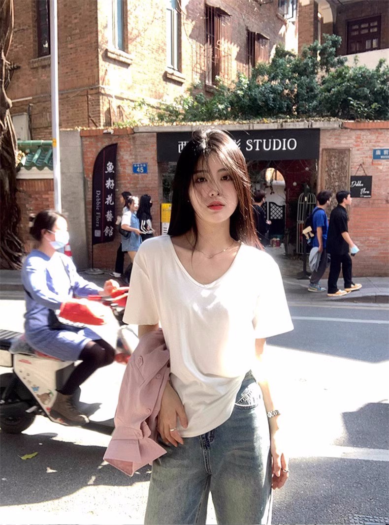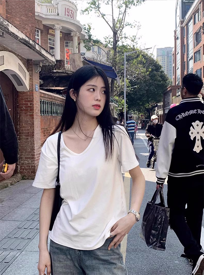 모조 코튼 밀크 실크 화이트 V 넥 오른쪽 어깨 여성용 다목적 반팔 티셔츠 여름 새로운 다목적 바닥 셔츠 내부 탑스토어 가기