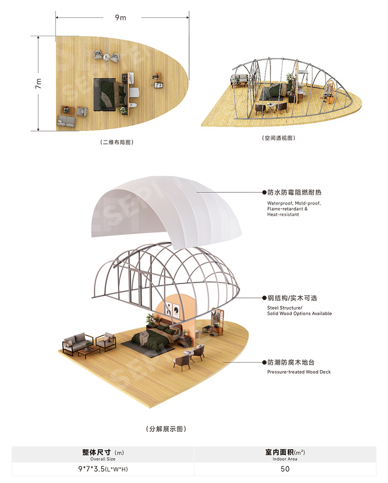 쉘 텐트 호텔, 태풍 방지 철골 구조 + PVDF 필름 소재, 고급 야외 럭셔리 빌라, 방음 및 단열 캠핑스토어 가기