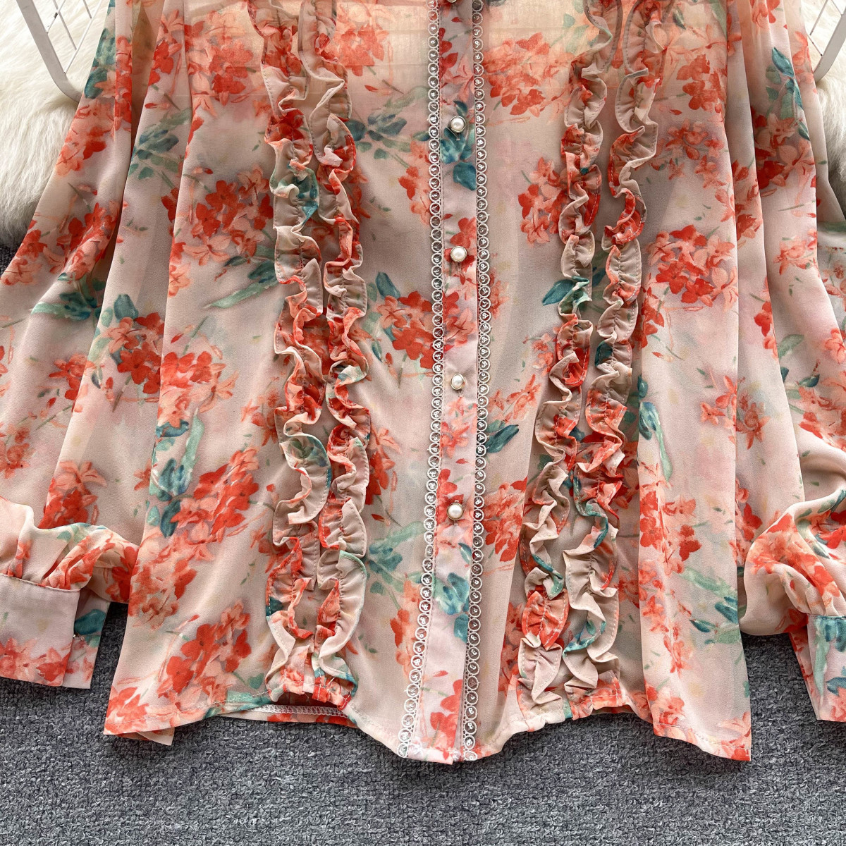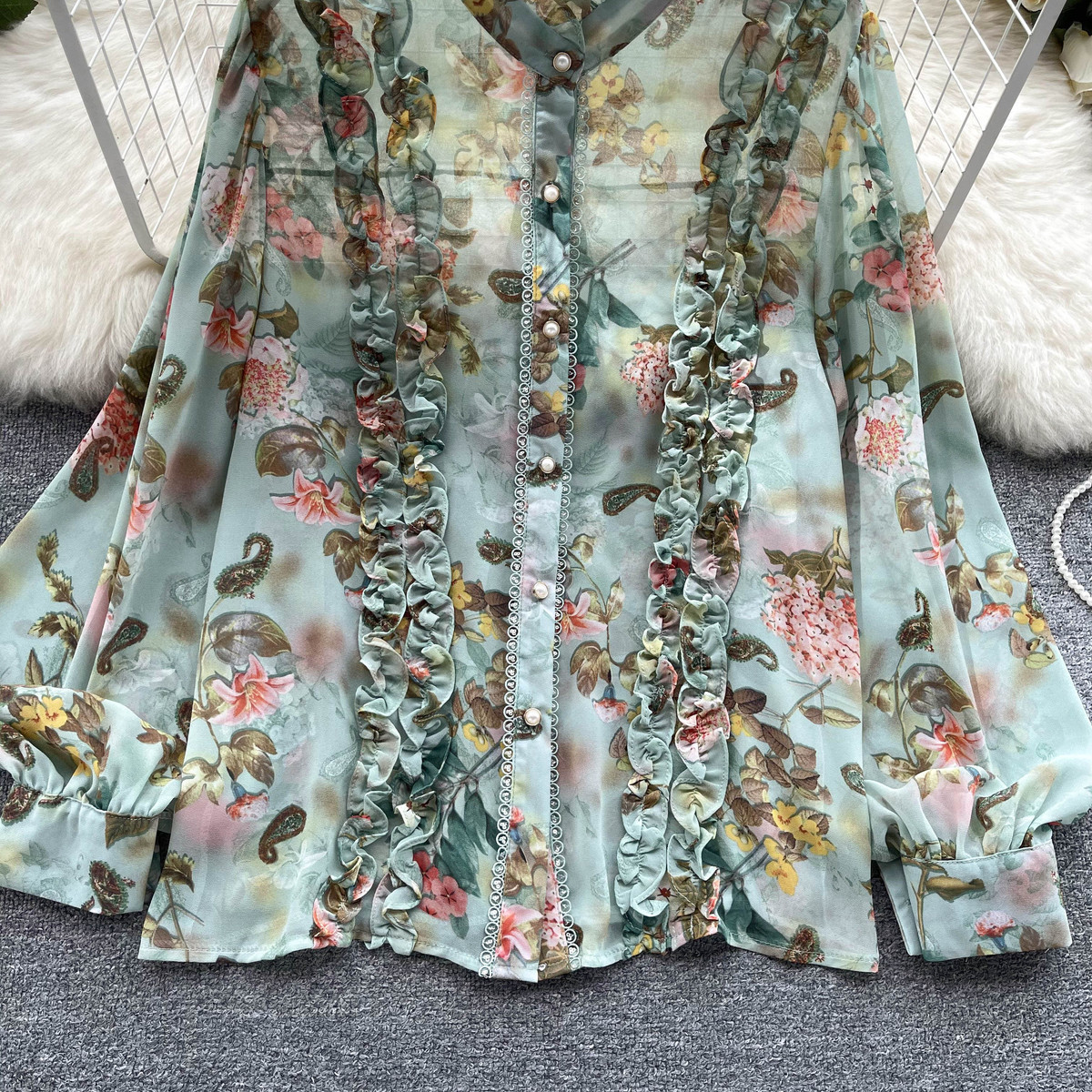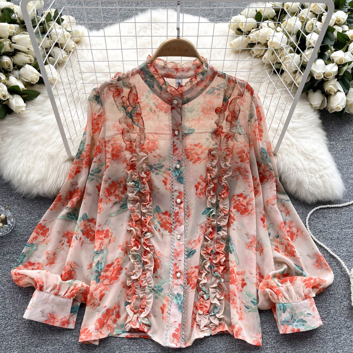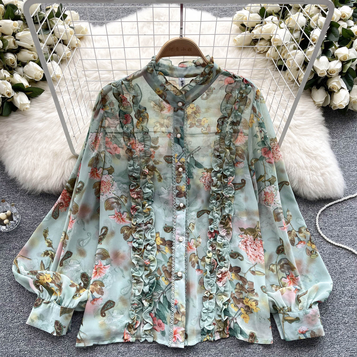 프랑스 스타일 달콤한 인쇄 쉬폰 셔츠 셔츠 여성용 봄 디자인 센스 우아한 세련된 러플 랜턴 슬리브 탑스토어 가기