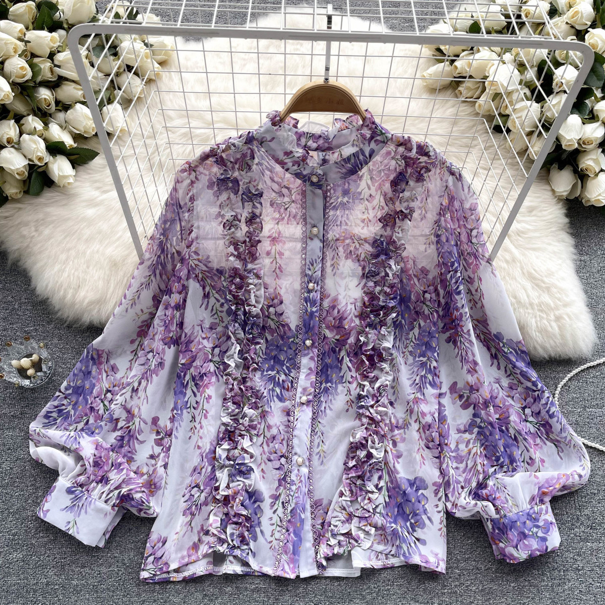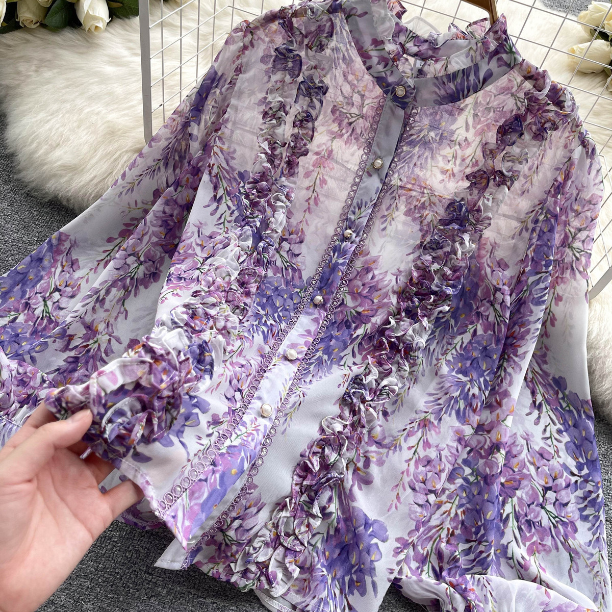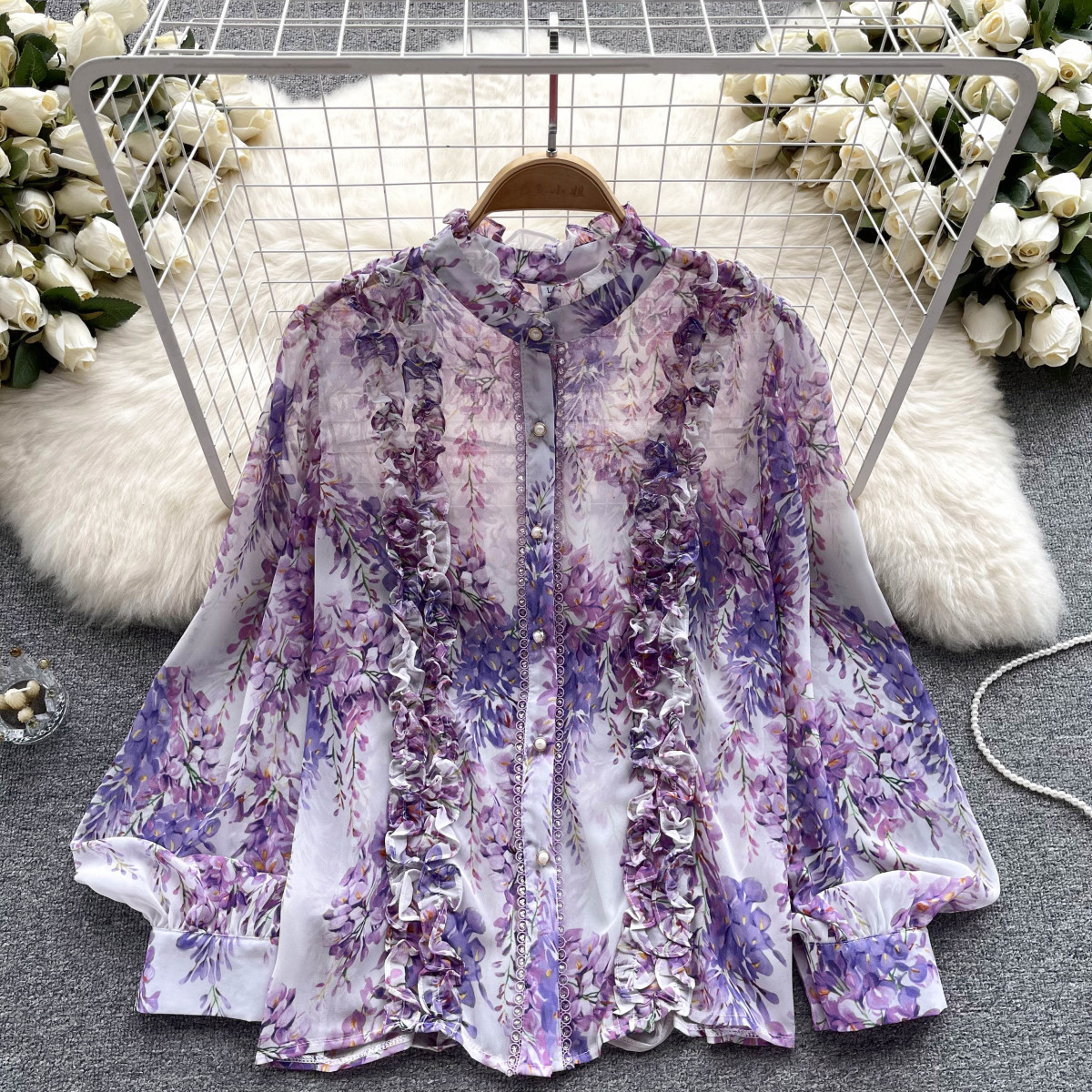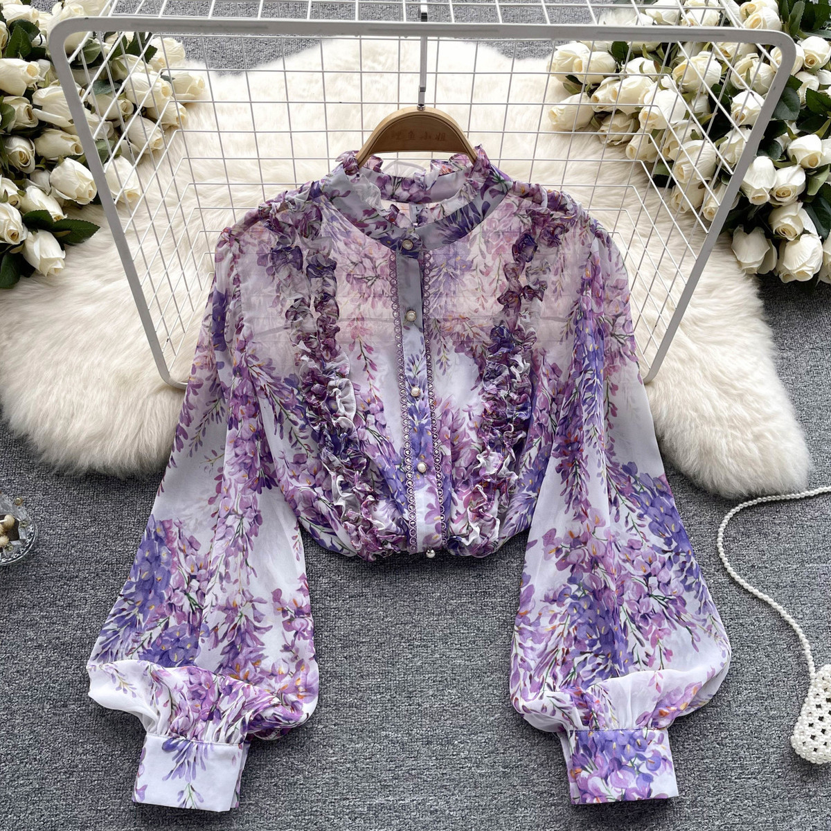 프랑스 스타일 달콤한 인쇄 쉬폰 셔츠 셔츠 여성용 봄 디자인 센스 우아한 세련된 러플 랜턴 슬리브 탑스토어 가기