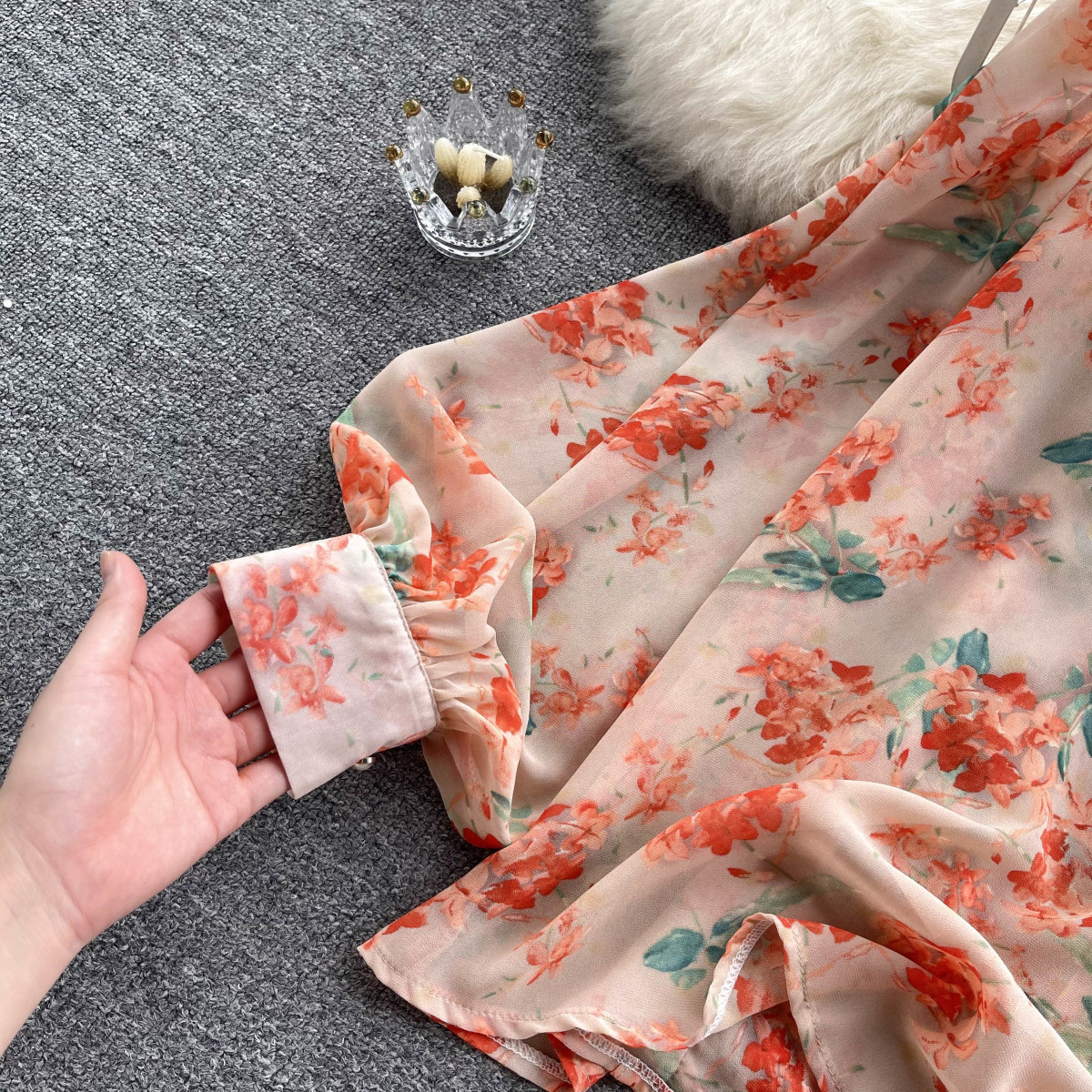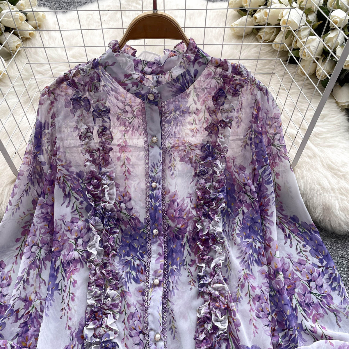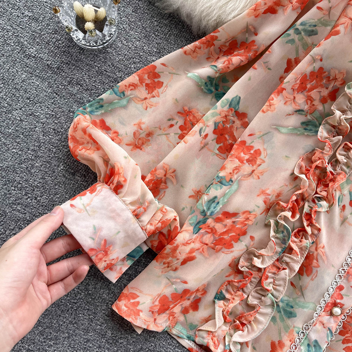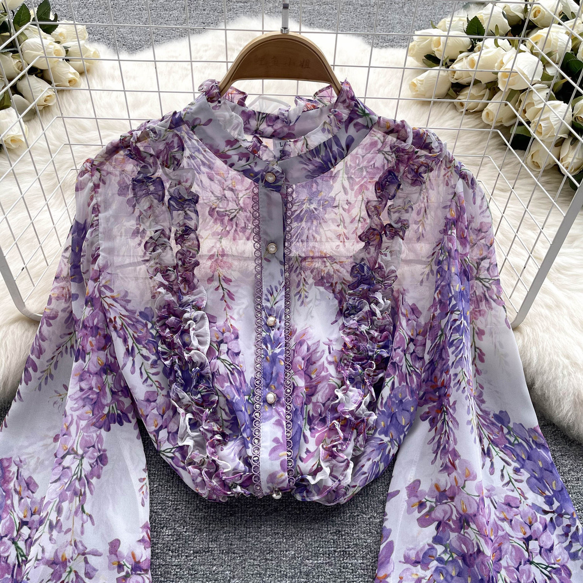프랑스 스타일 달콤한 인쇄 쉬폰 셔츠 셔츠 여성용 봄 디자인 센스 우아한 세련된 러플 랜턴 슬리브 탑스토어 가기
