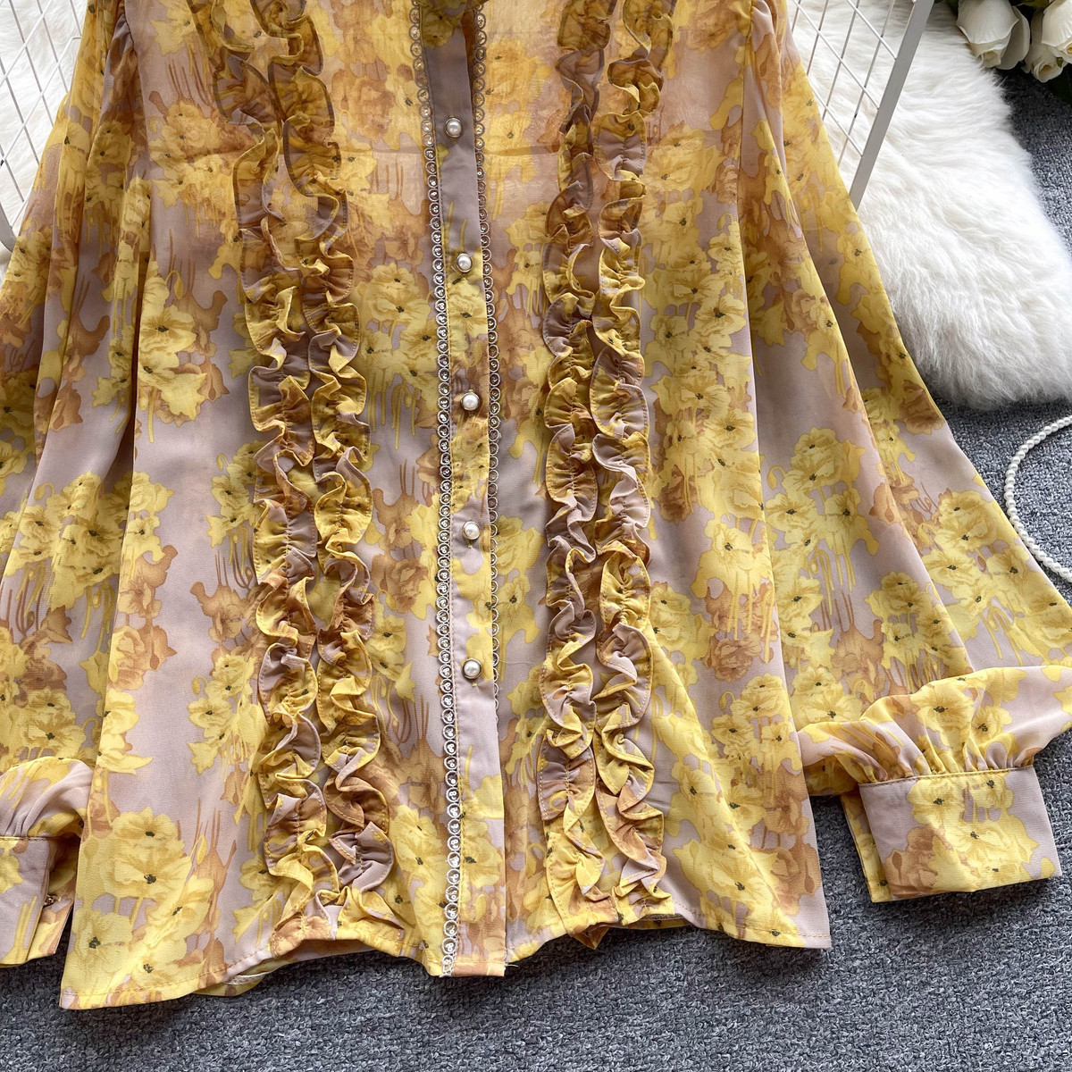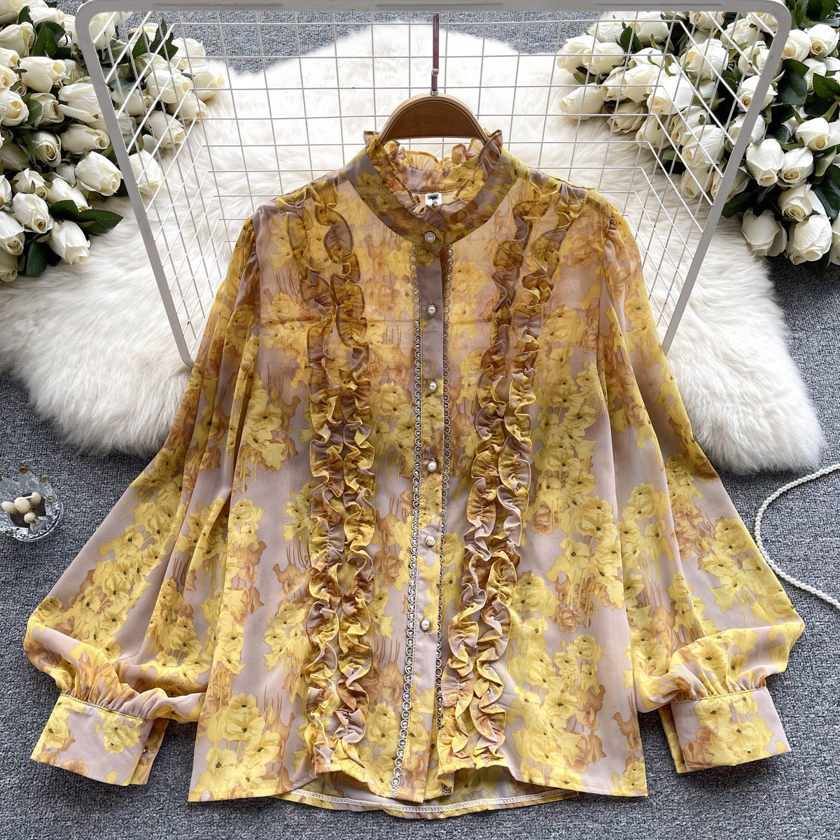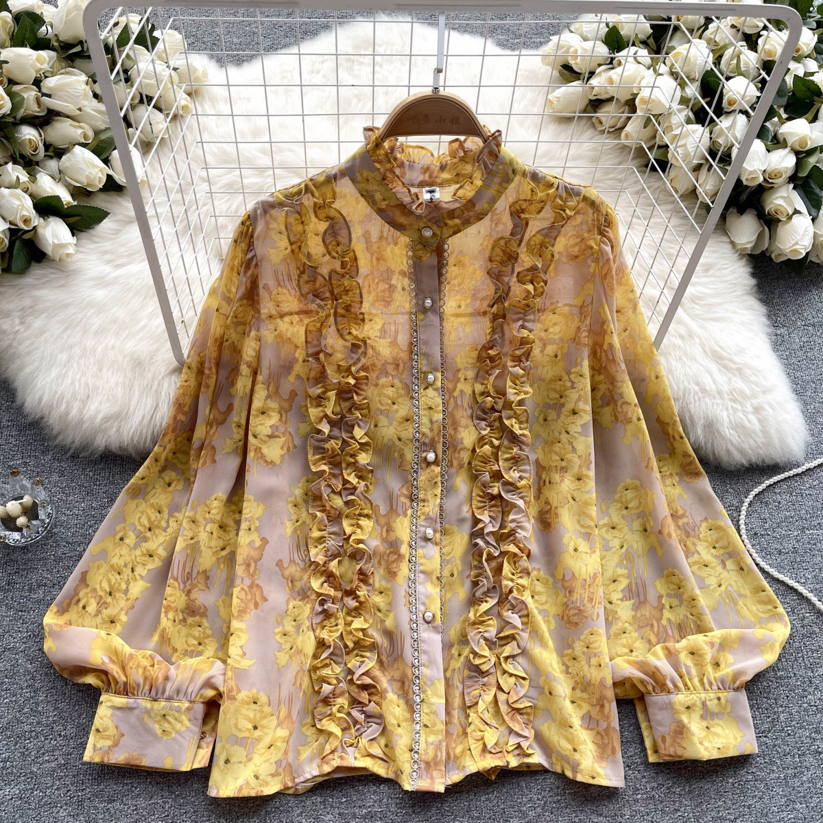 프랑스 스타일 달콤한 인쇄 쉬폰 셔츠 셔츠 여성용 봄 디자인 센스 우아한 세련된 러플 랜턴 슬리브 탑