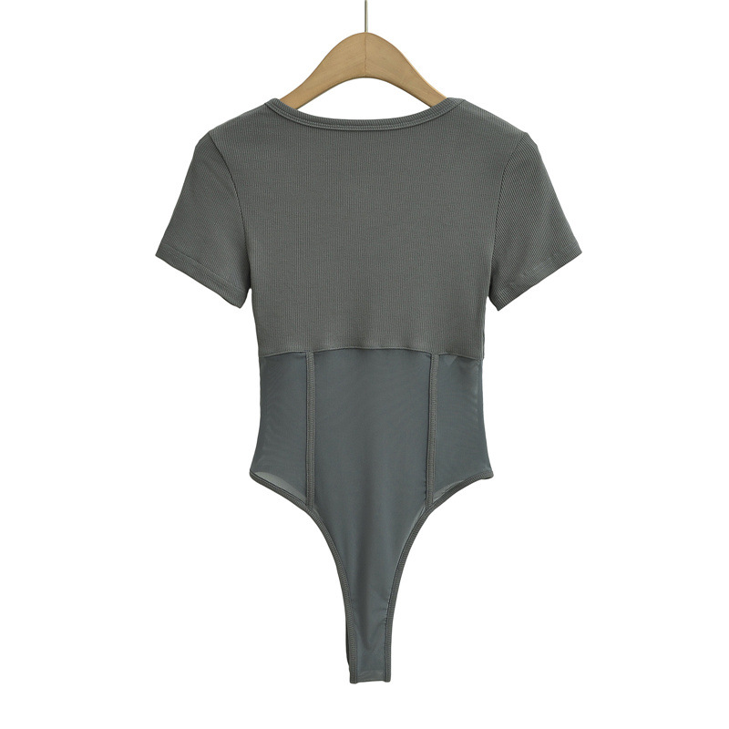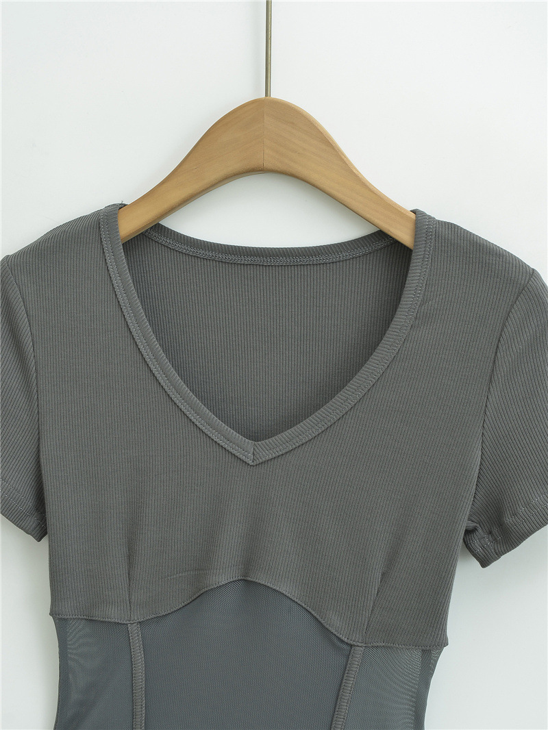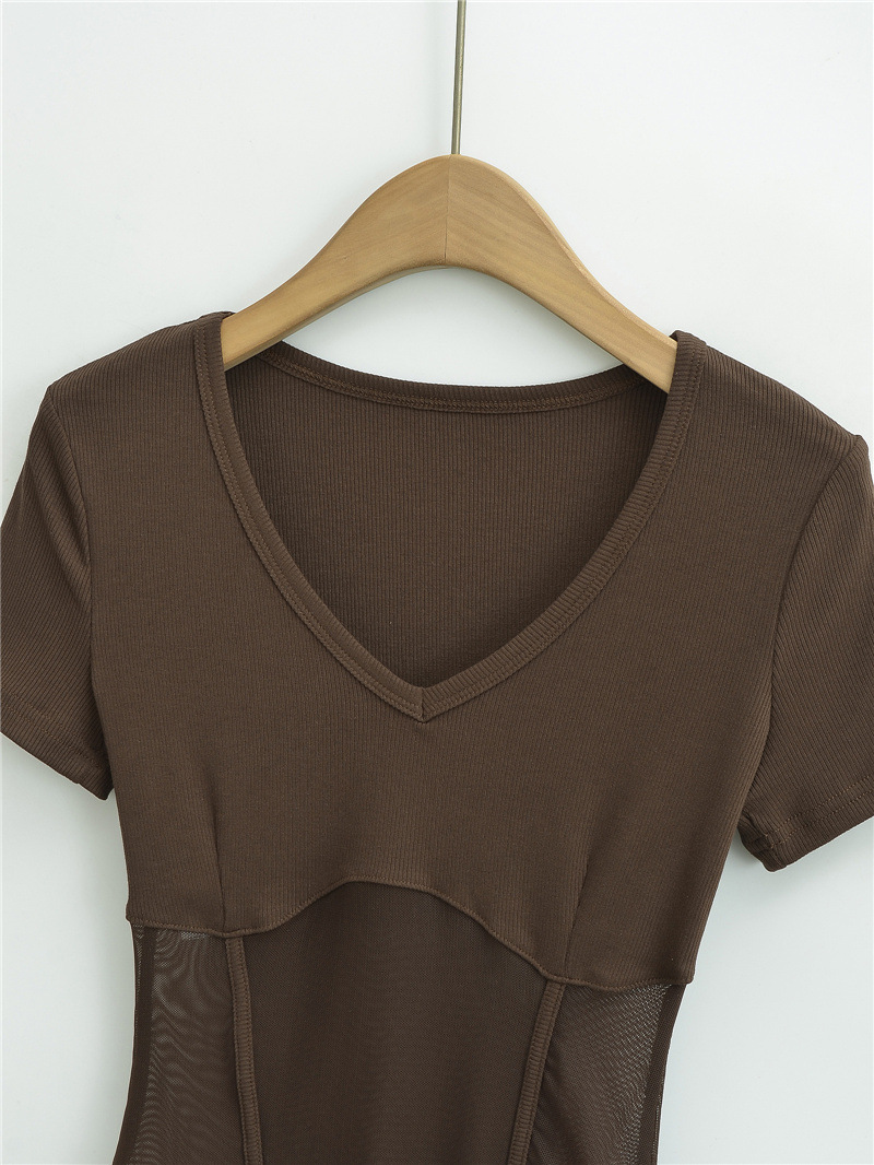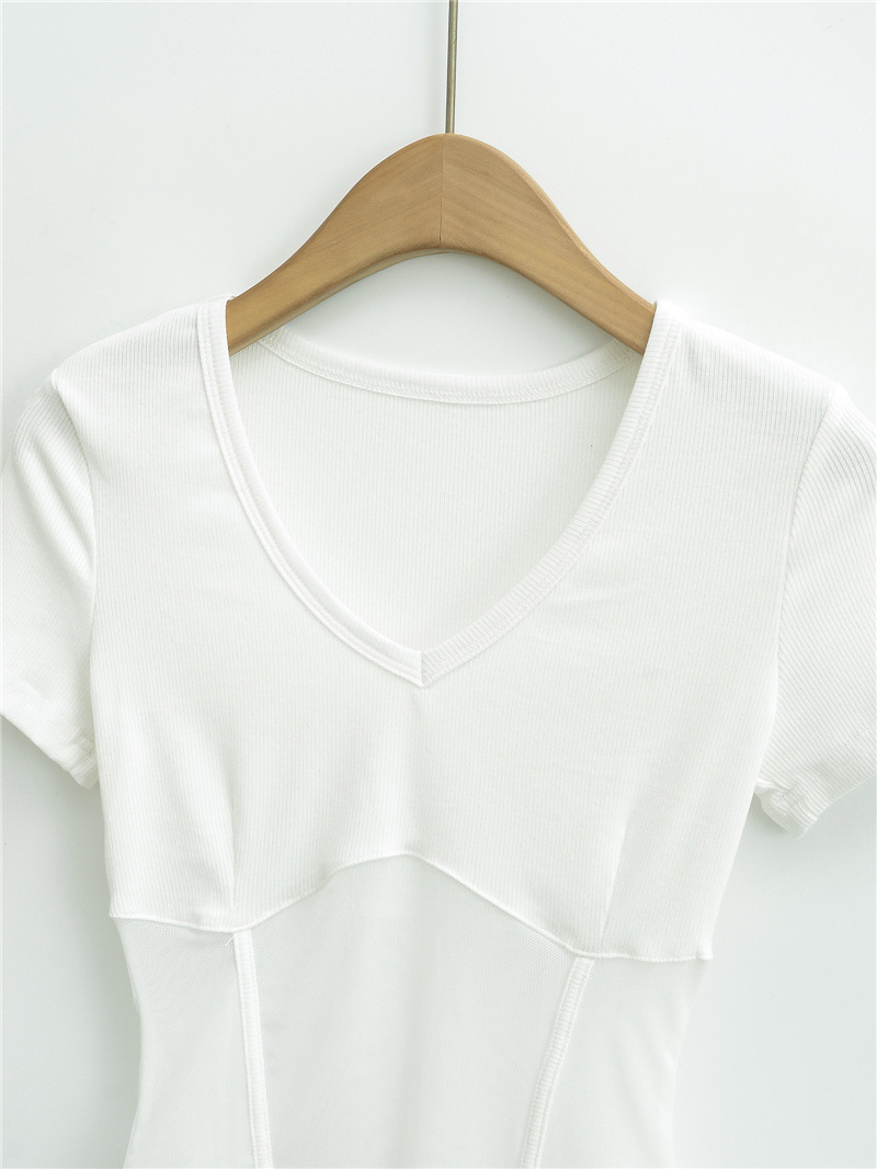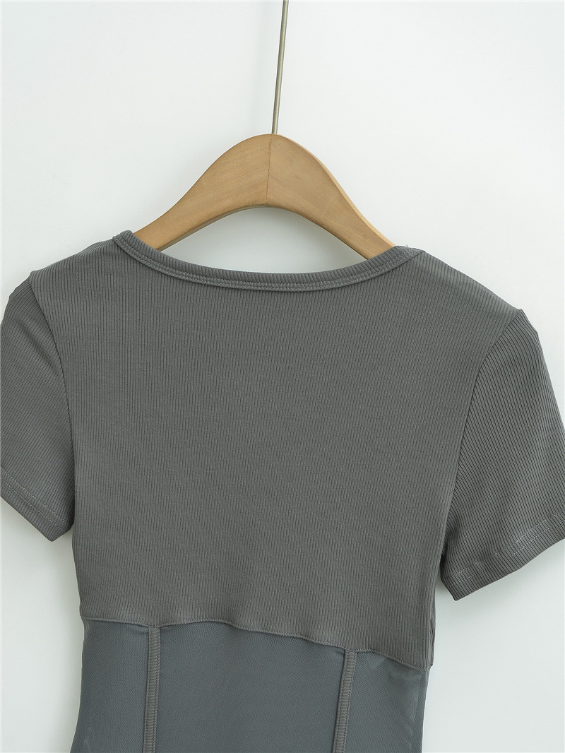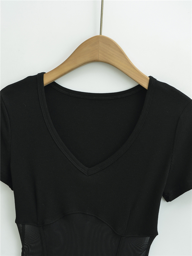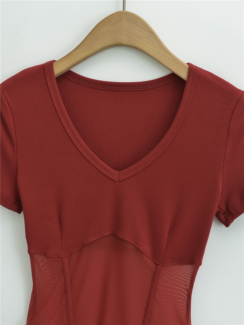 유럽과 미국 스타일의 디자인 센스 메쉬 원피스 스티칭 핫 소녀 반팔 원피스 티셔츠 여름 새로운 슬림 핏 섹시한 탑