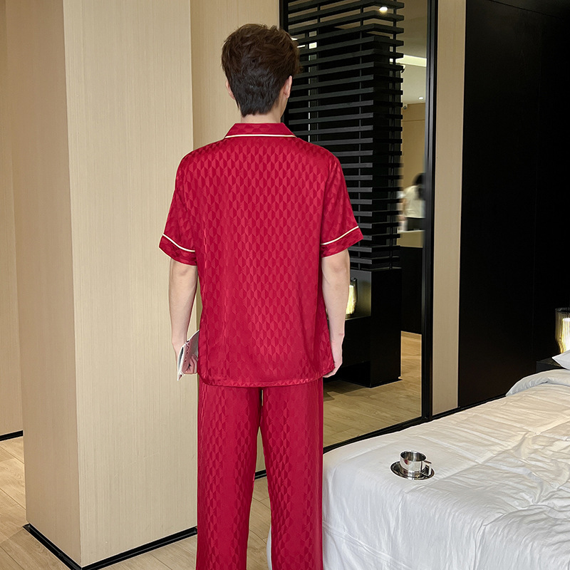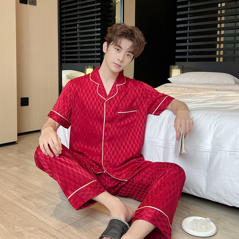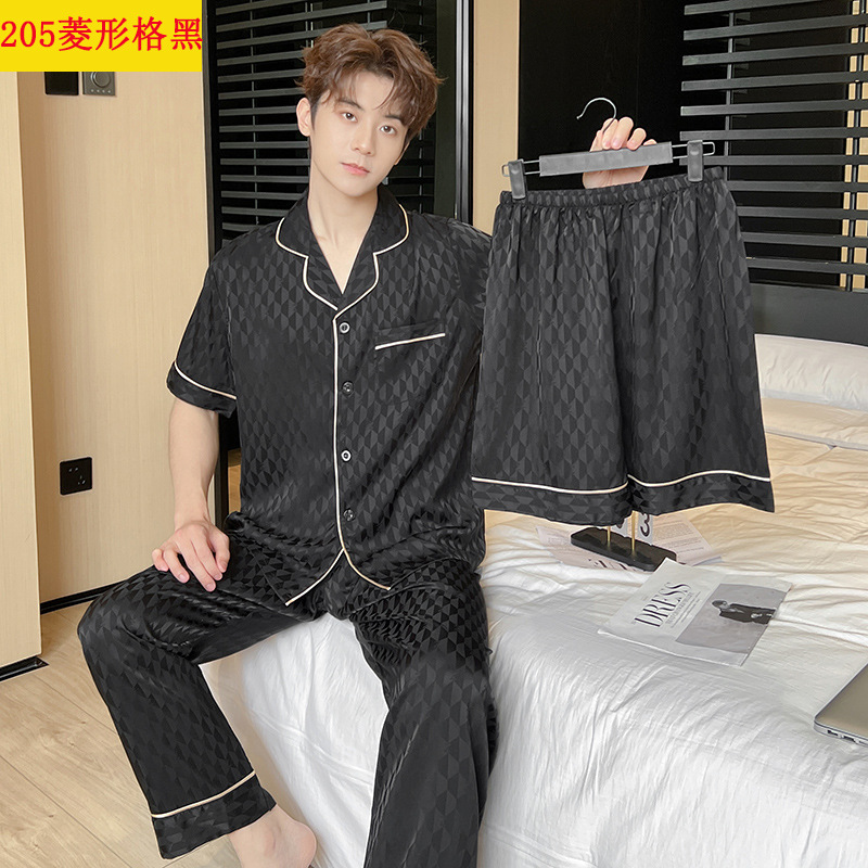 잠옷 남자 여름 아이스 실크 반팔 바지 반바지 3 종 세트 자카드 하이 엔드 실크 여름 홈 의류 세트