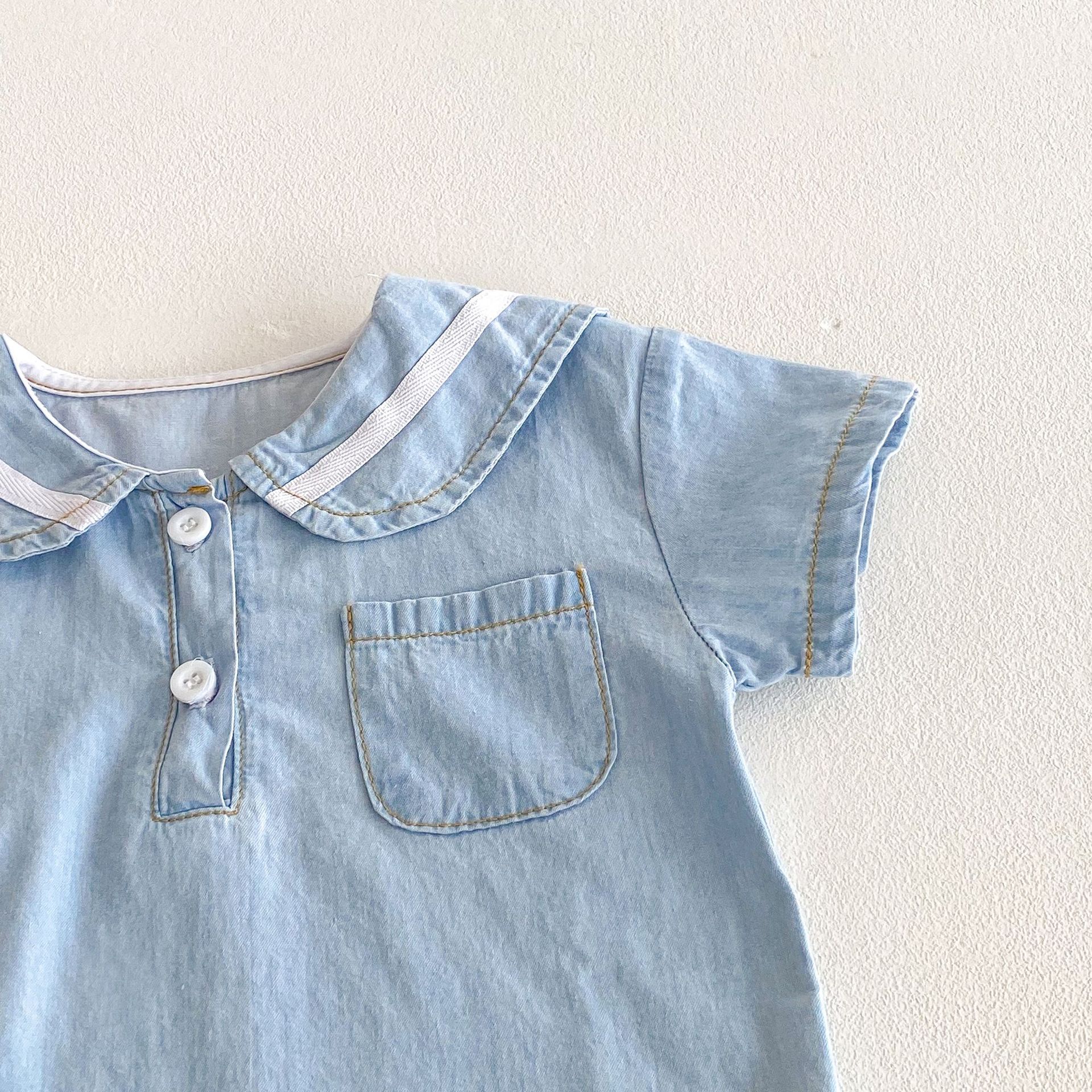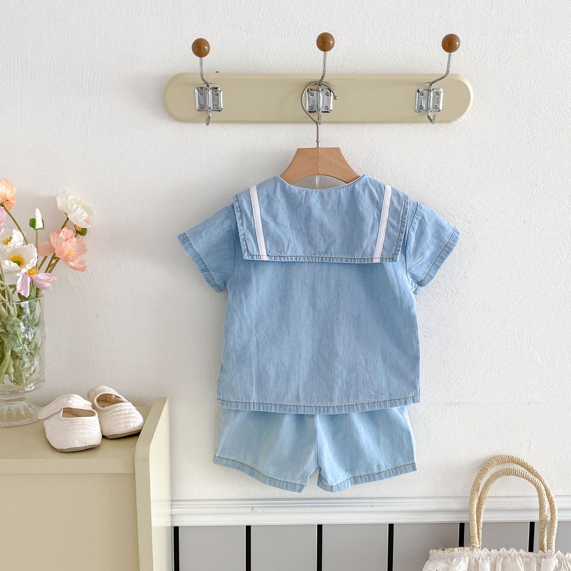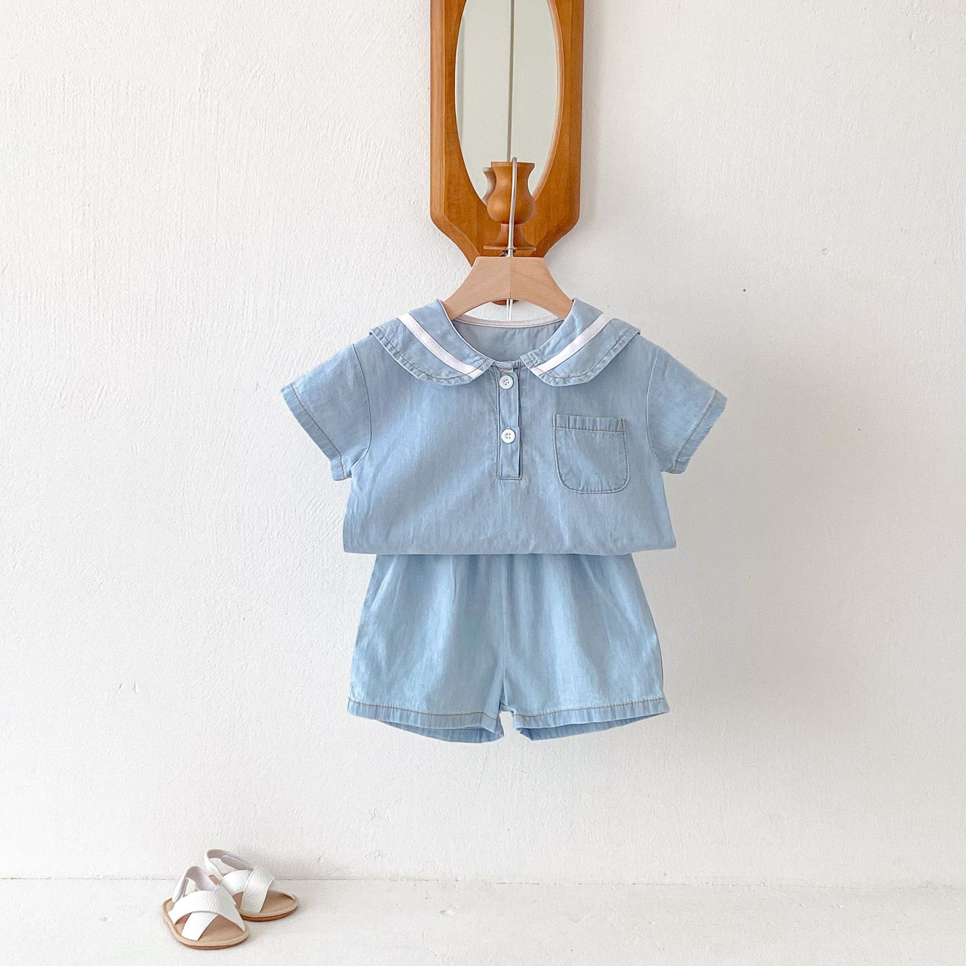 여름 2025 새로운 스타일 한국 스타일 아동복 소년 소녀 네이비 칼라 레이스 반팔 탑 반바지 데님 슈트