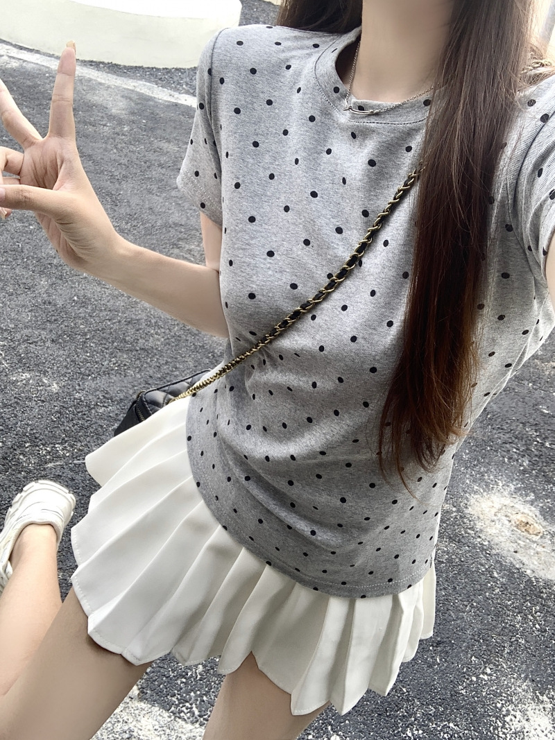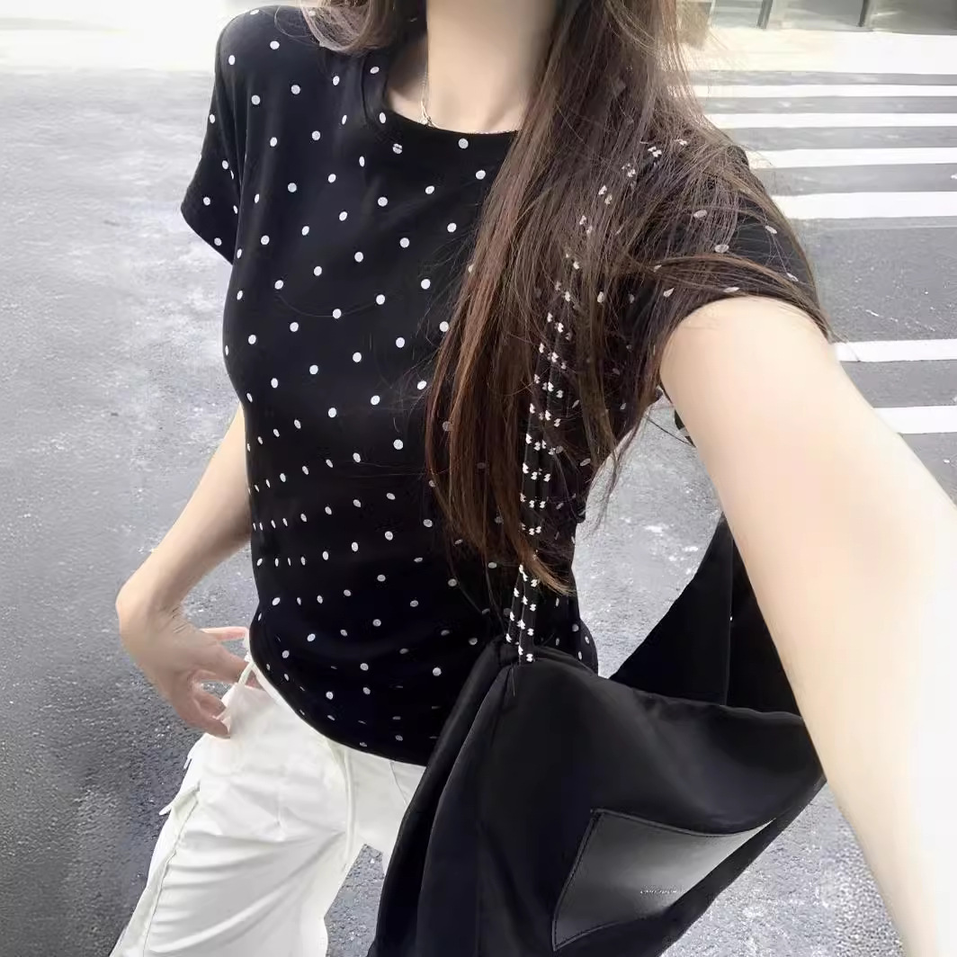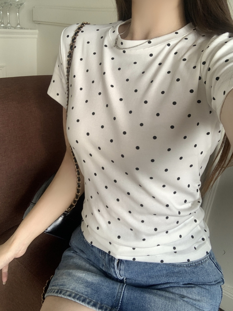 한국 스타일 폴카 도트 라운드 넥 디자인 센스 여름 규칙 어깨 반팔 티셔츠 여성용 느슨한 틈새 최고 트렌디 인스토어 가기