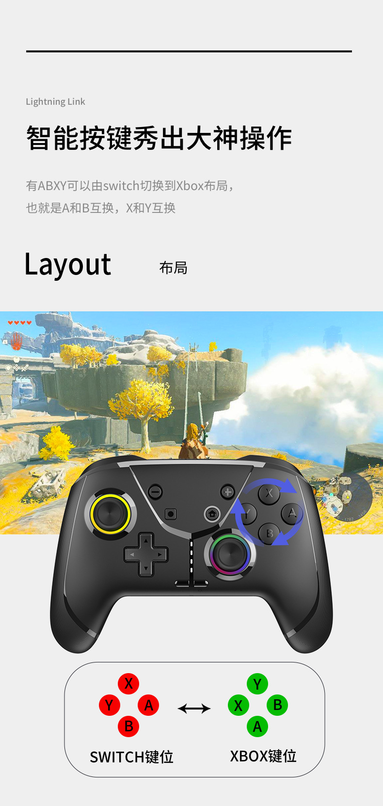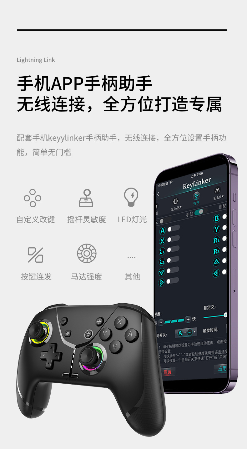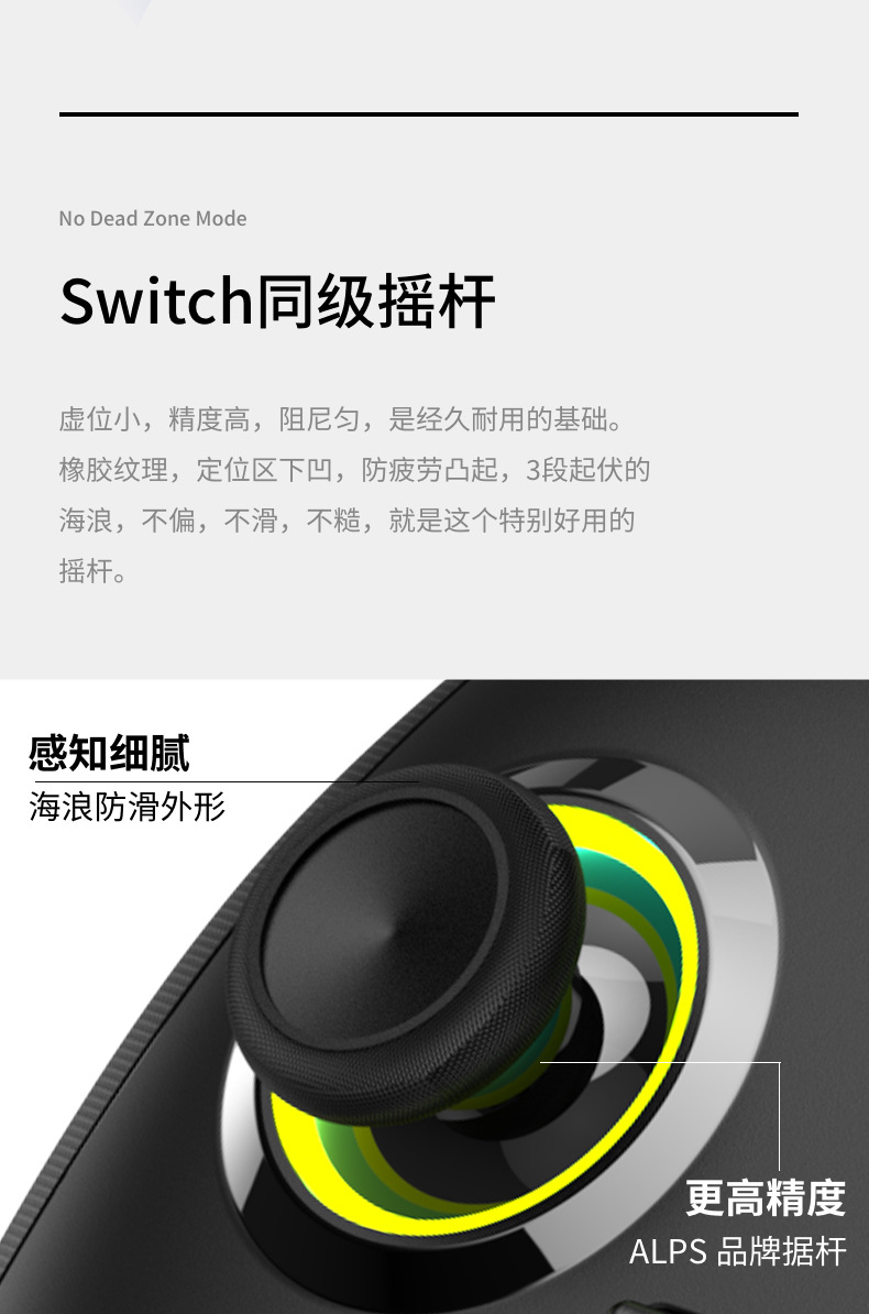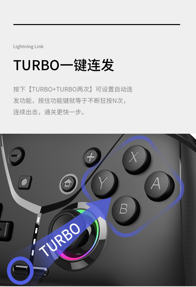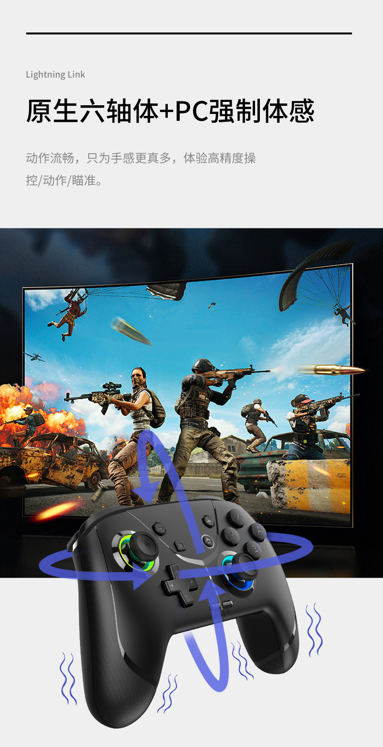 蓝牙连接:手柄可以连接具有蓝牙功能的 SWITCH 主机,手机,平板,电视,盒子等;