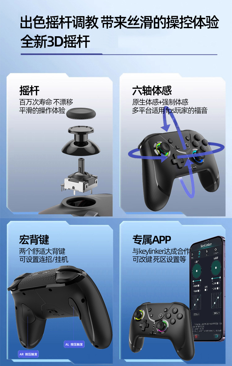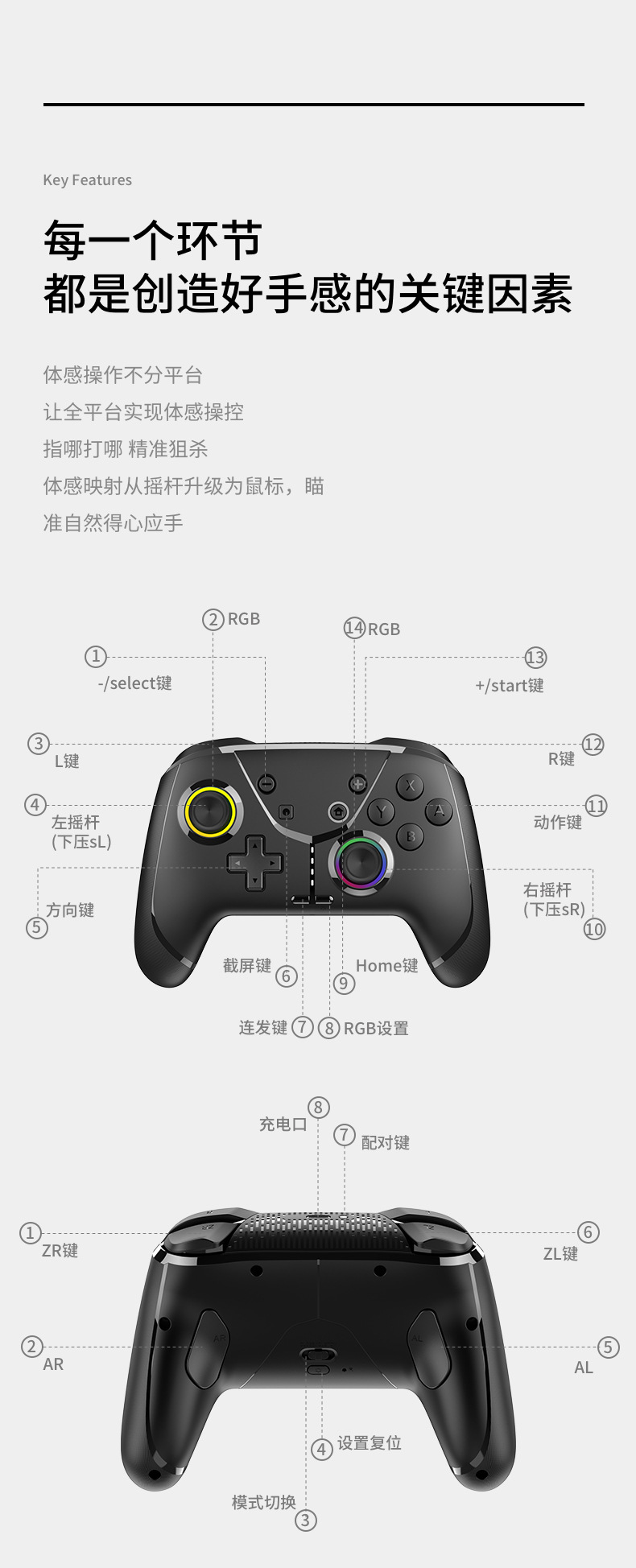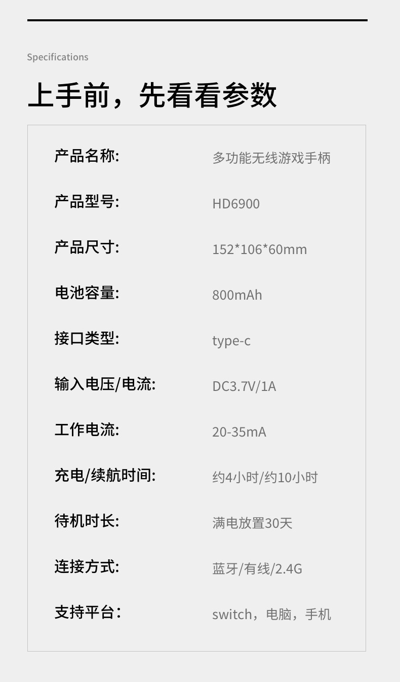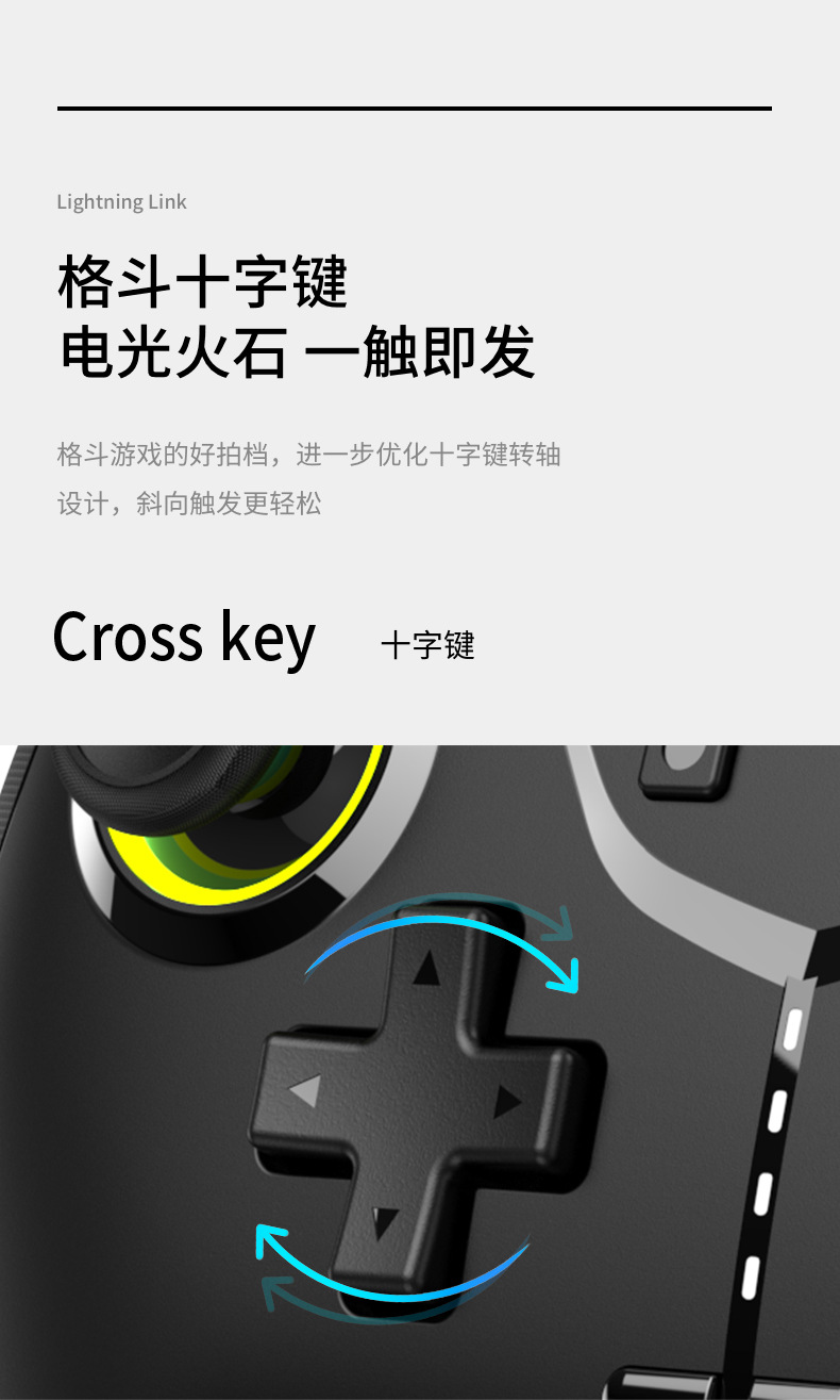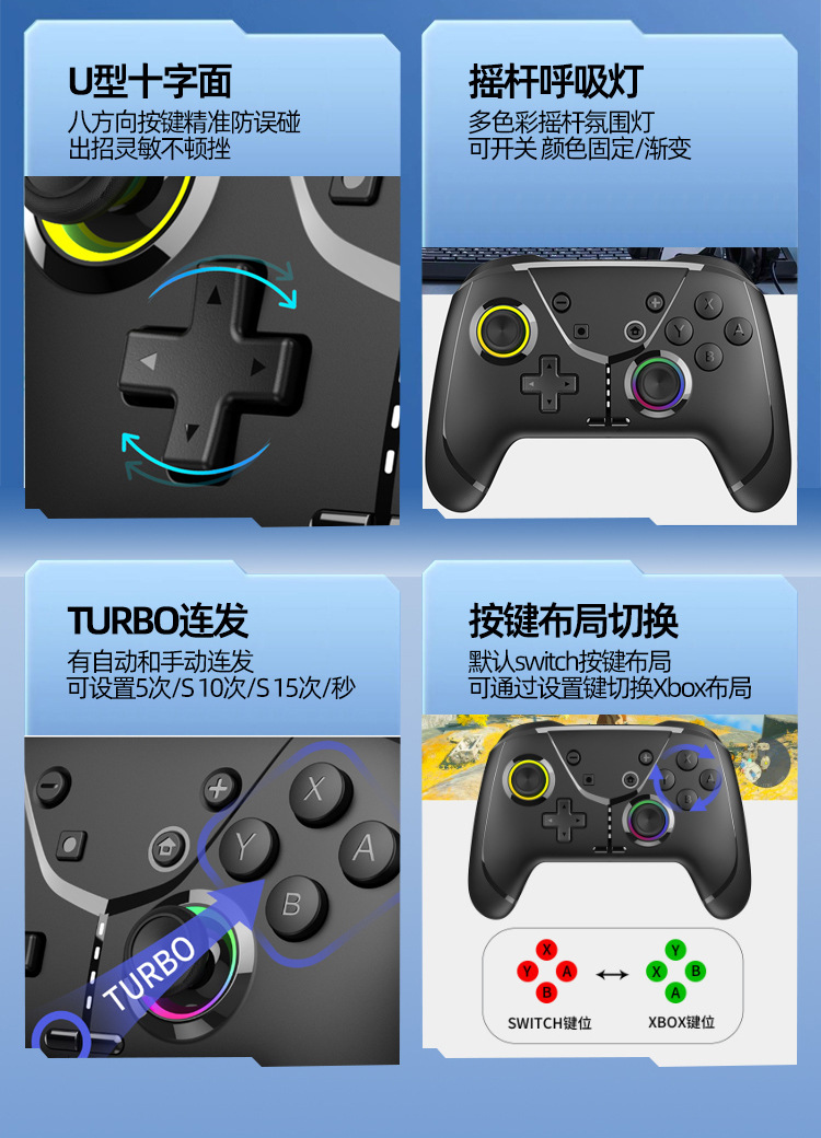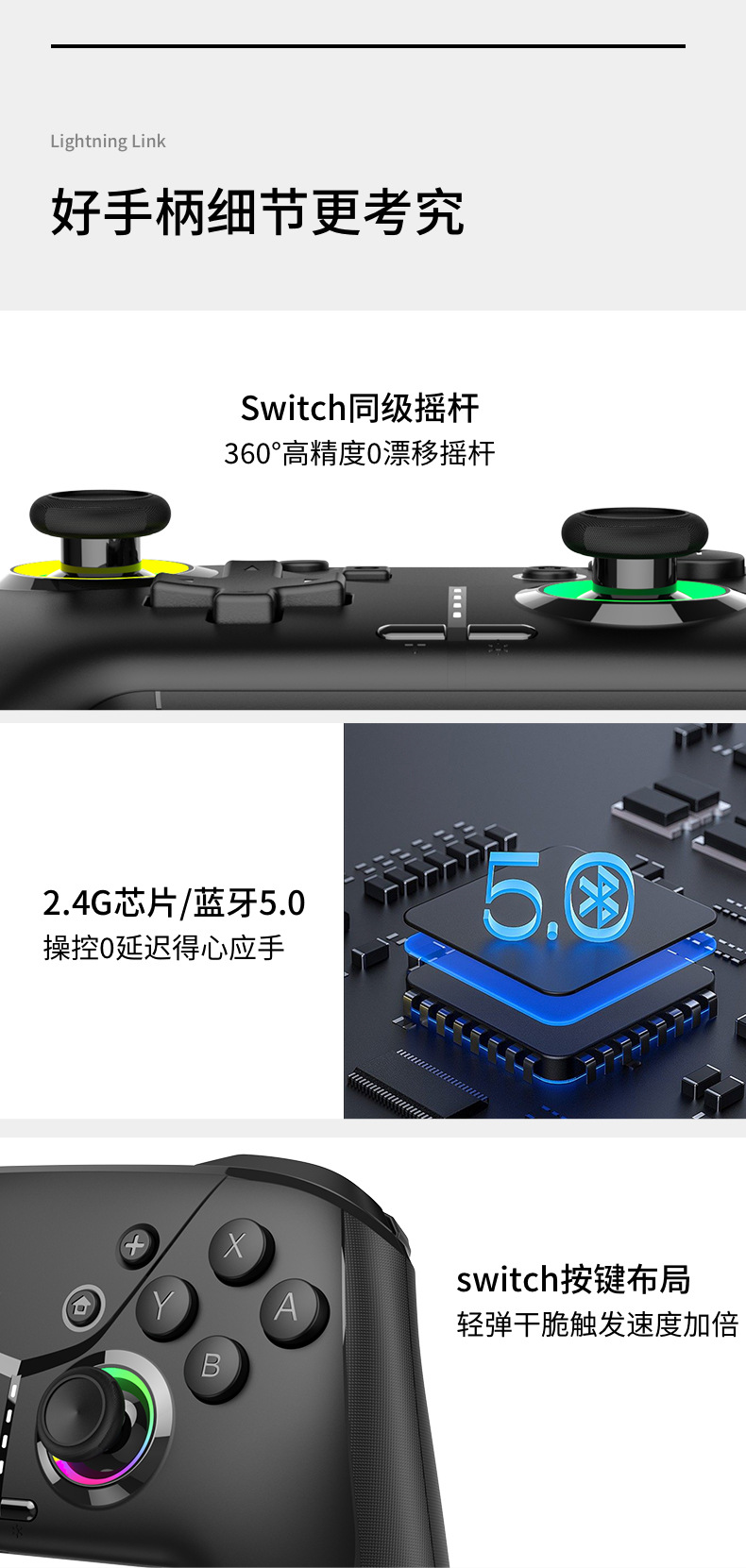 蓝牙连接:手柄可以连接具有蓝牙功能的 SWITCH 主机,手机,平板,电视,盒子等;