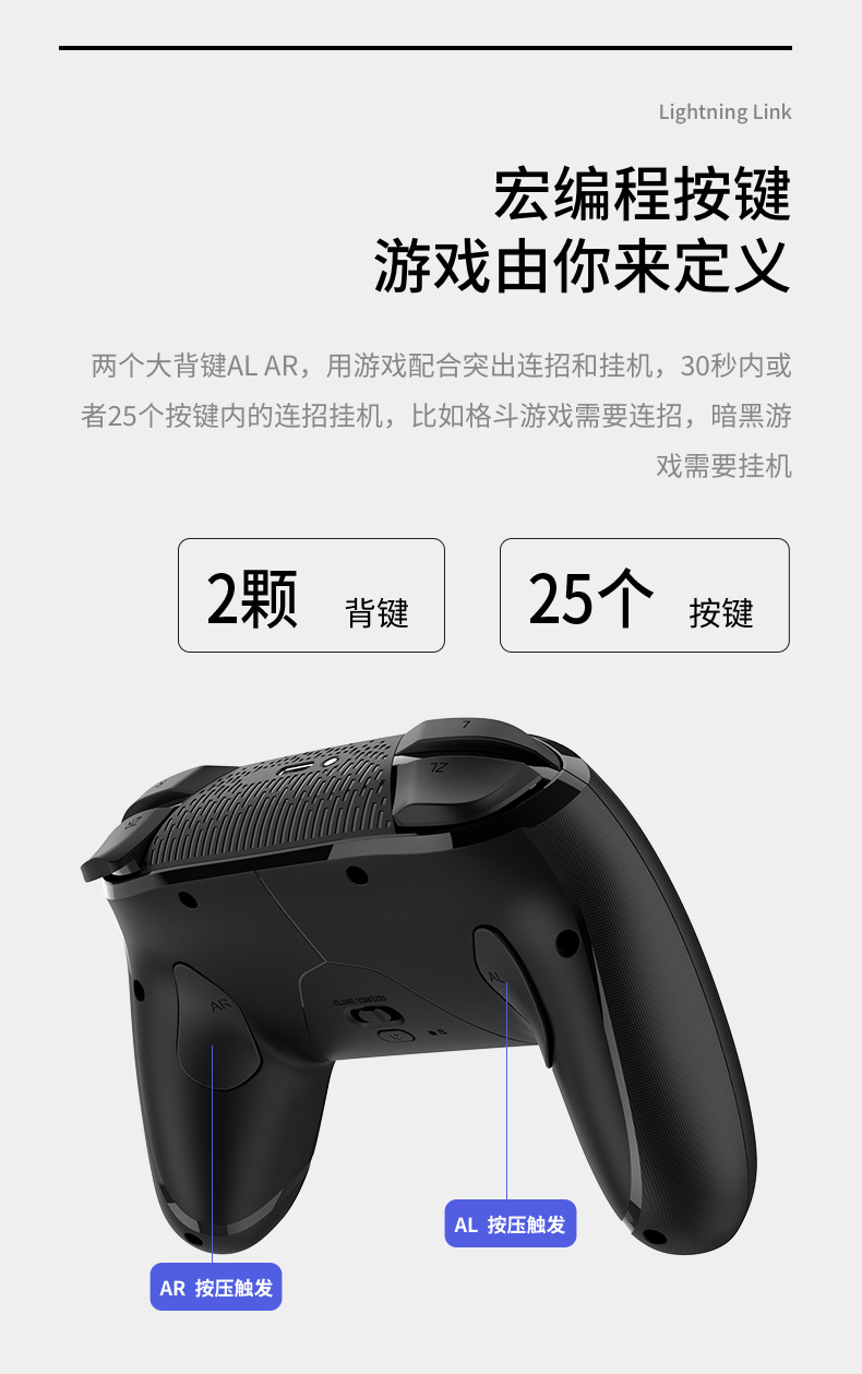 11、支持 2 个背键自定义编程功能(编程存储 30 秒,25 个按键动作);