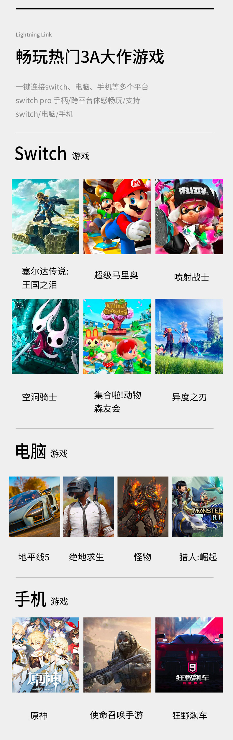 1、支持平台:任天堂Switch 全系列主机(支持唤醒)、苹果IOS/MAC OS 设备(手机、平板、电脑)、电脑(windows7以上)、Android设备(手机、车载智慧屏、平板、电视、机顶盒);
