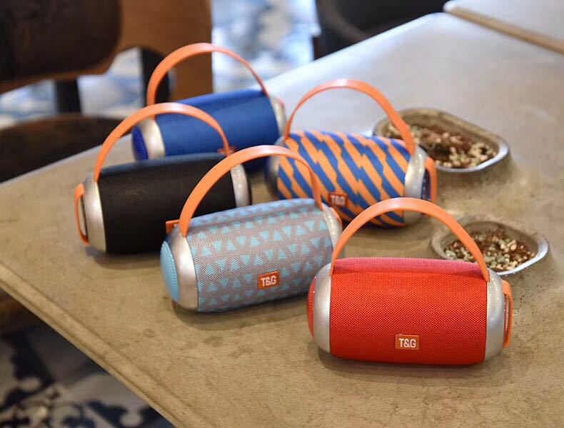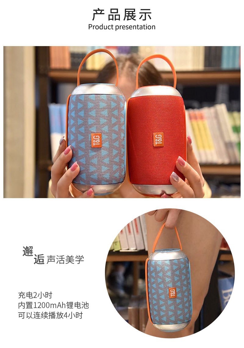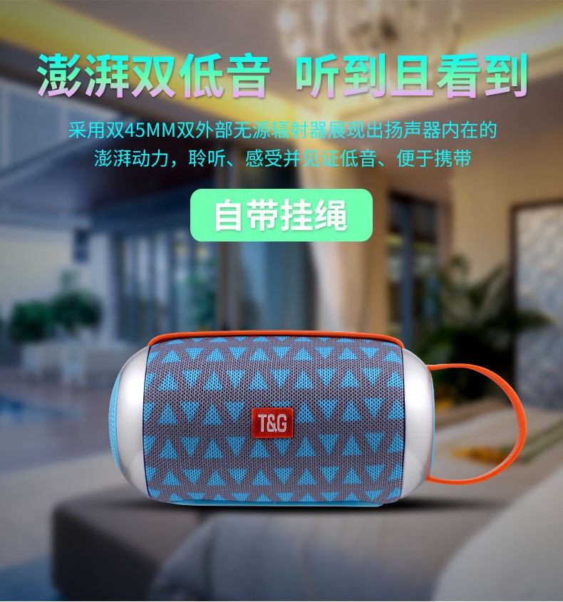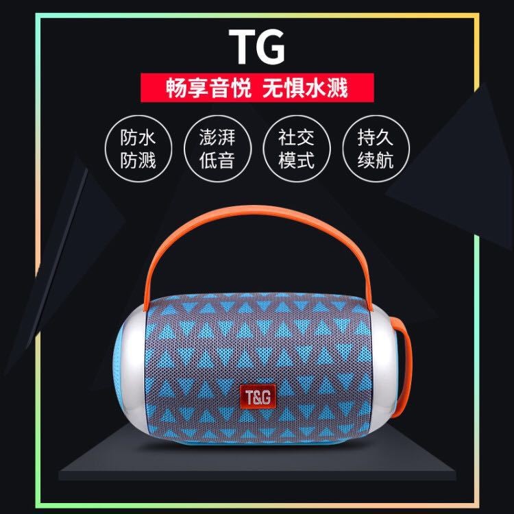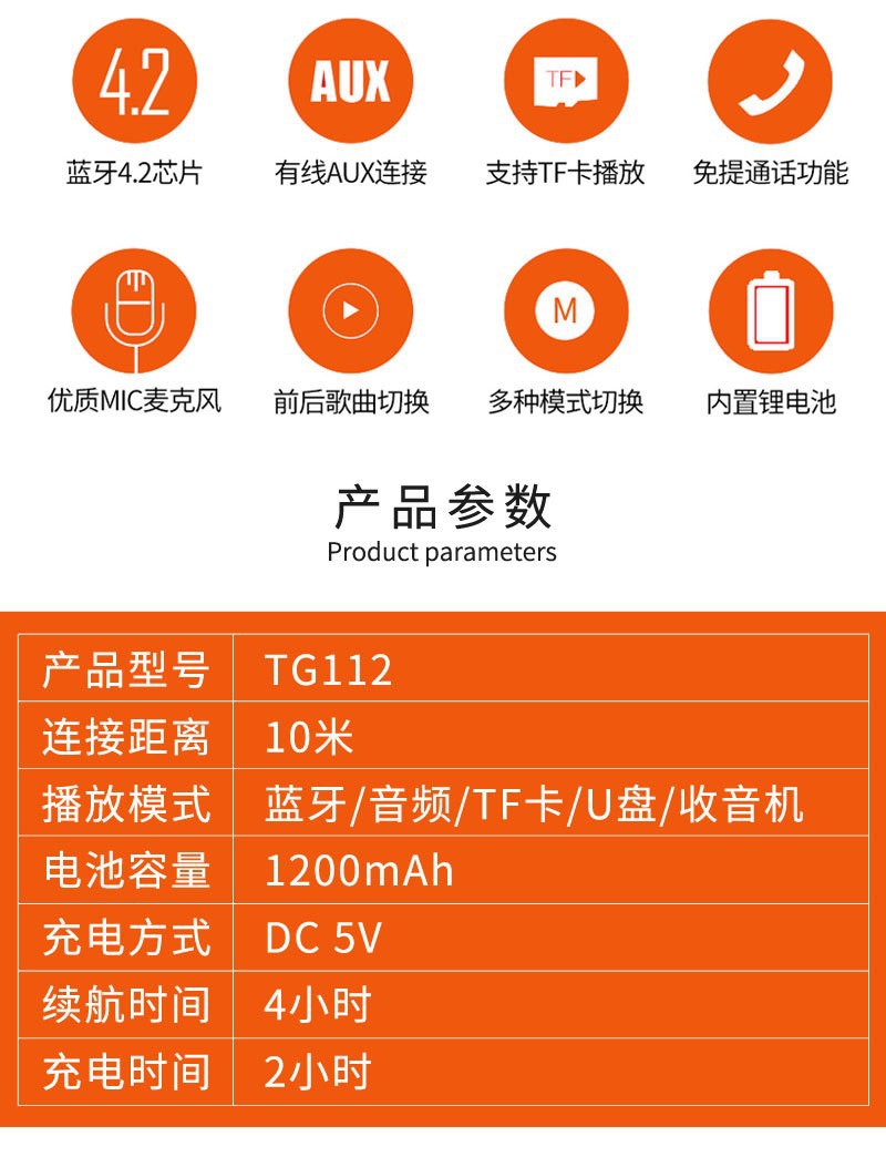防水蓝牙音箱双振膜户外便携蓝牙插卡音响TG112迷你运动低音炮,澎湃双低音,采用45MM双外部无源辐射器展现出扬声器内在的澎湃动力,聆听,感受并见证低音,无惧雨水浸袭,音乐通话,一键切换。供电方式: 内置锂电池功能: 大功率双喇叭、重低音立体声。具有免提功能. 产品参数 产品名称:TG-112 蓝牙版本:5.0 传输范围:10M 电池容量:1200mAh 播放时间:4-6h 内置电压:3.7V 喇叭功率:2*5W 单机尺寸:79*185*79mm 单机重量:600G 每件数量:40PCS 纸箱规格:51*39*35cm 每件重量:27.4KG