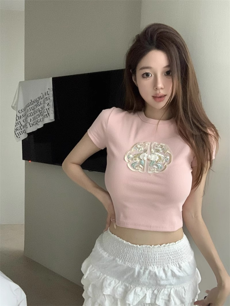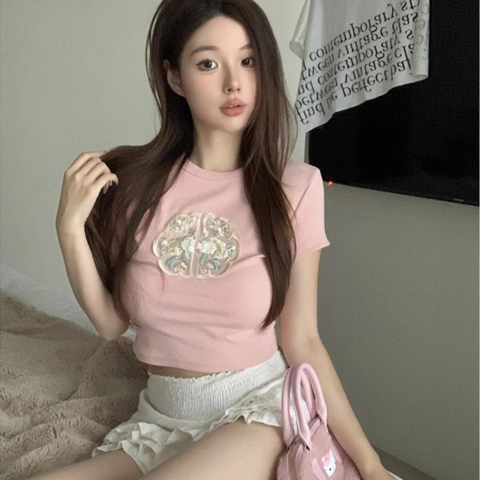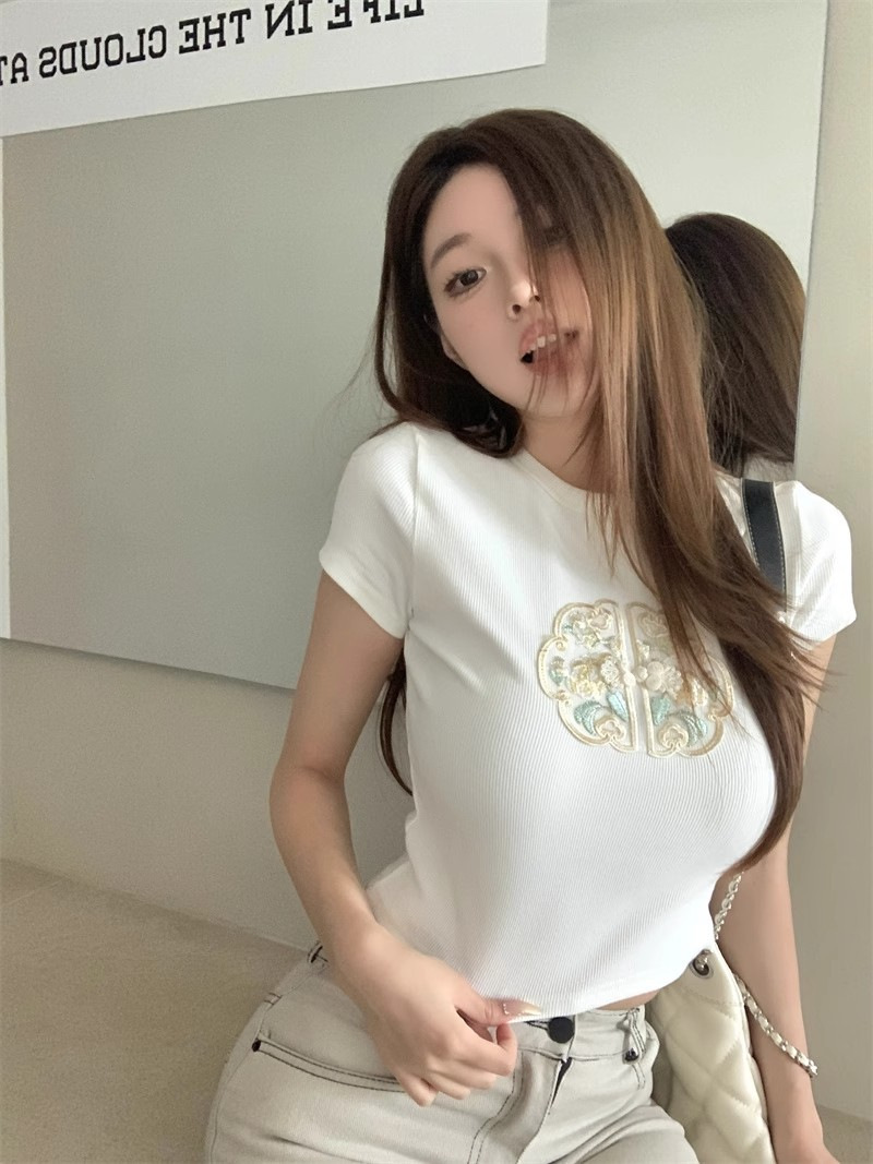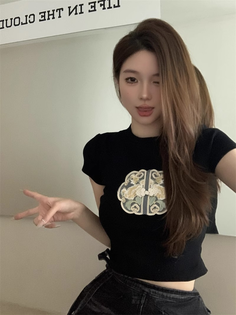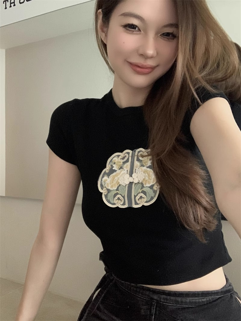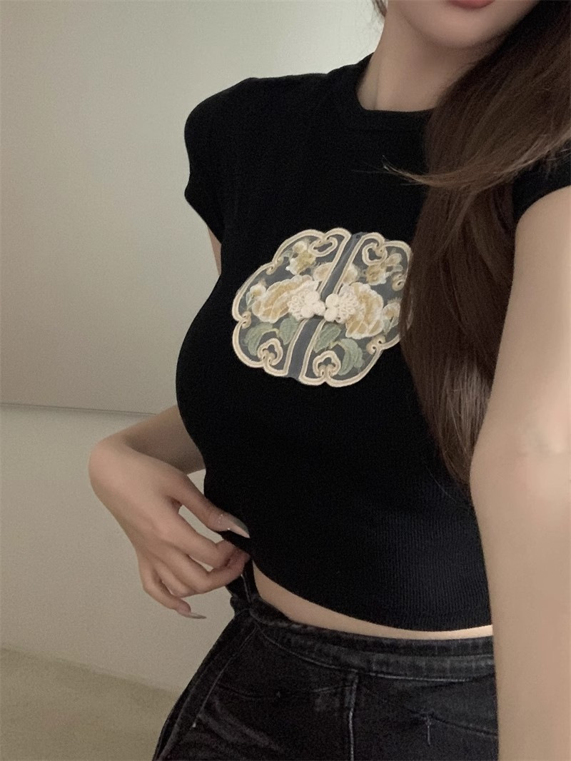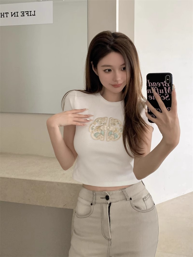 자수 된 새로운 중국 스타일 어깨 반팔 티셔츠 여성 여름 새로운 슬림 핏 신선한 달콤한 짧은 탑 인스 타 그램 스타일 트렌디스토어 가기