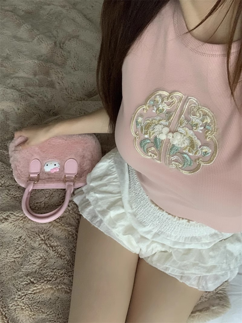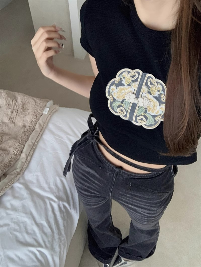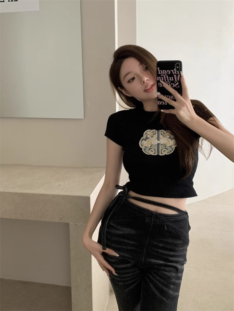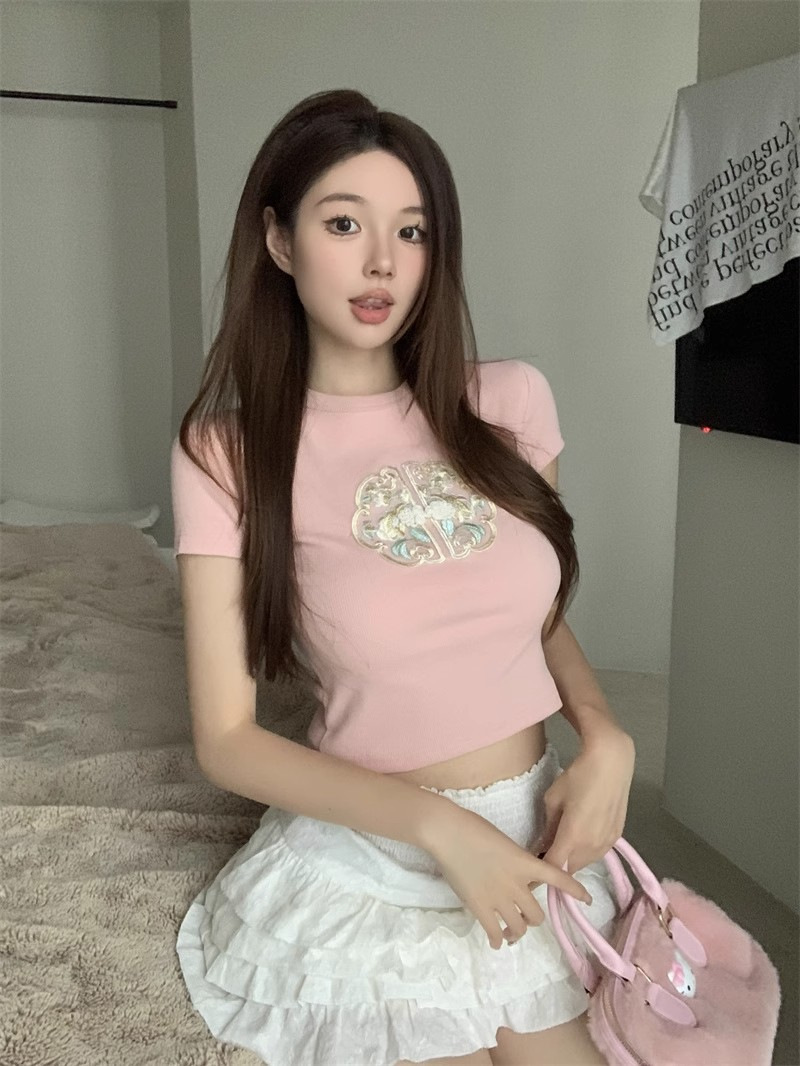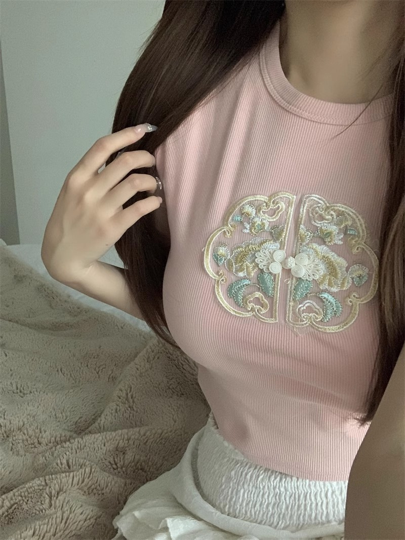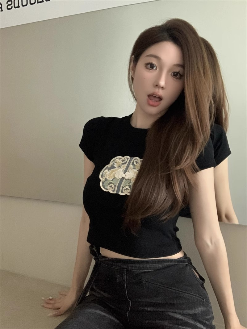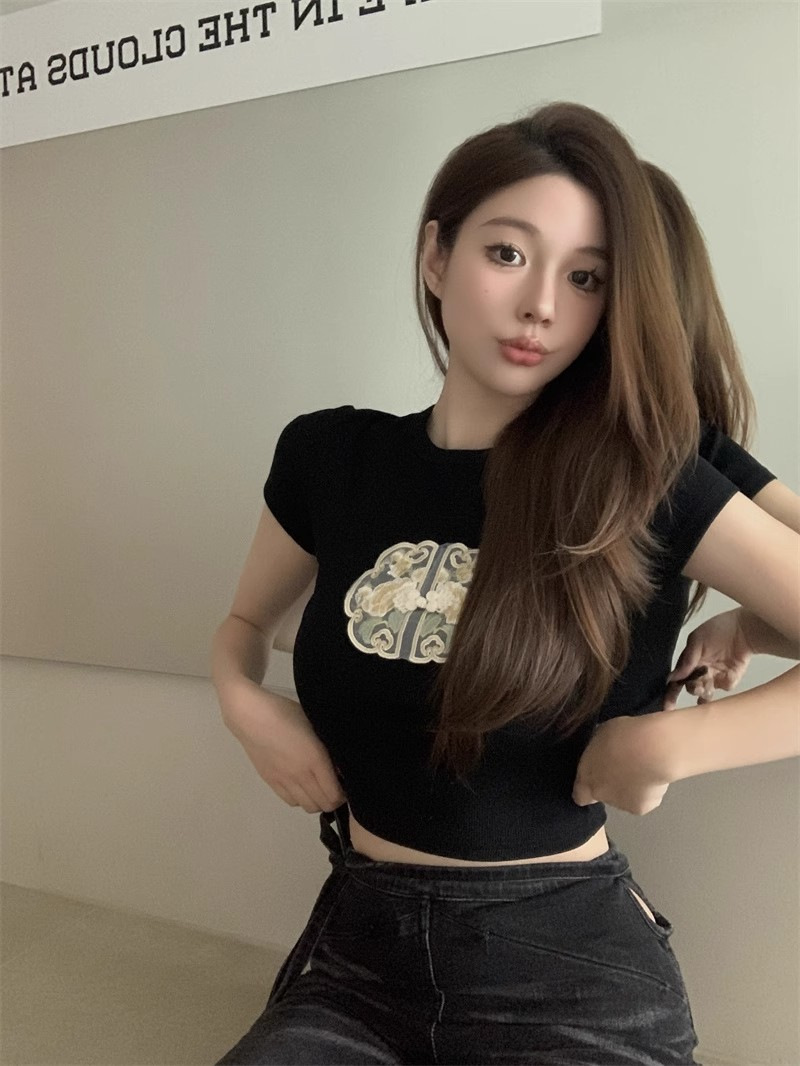 자수 된 새로운 중국 스타일 어깨 반팔 티셔츠 여성 여름 새로운 슬림 핏 신선한 달콤한 짧은 탑 인스 타 그램 스타일 트렌디스토어 가기