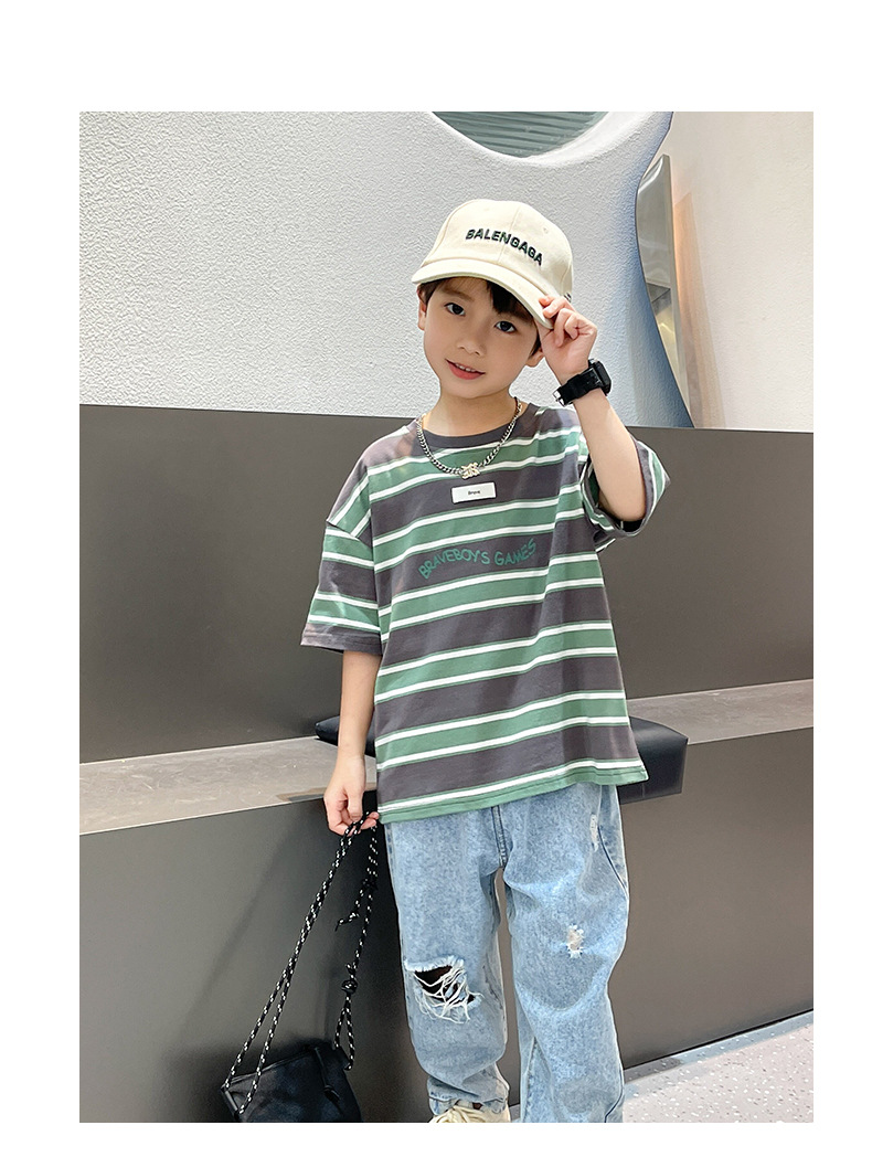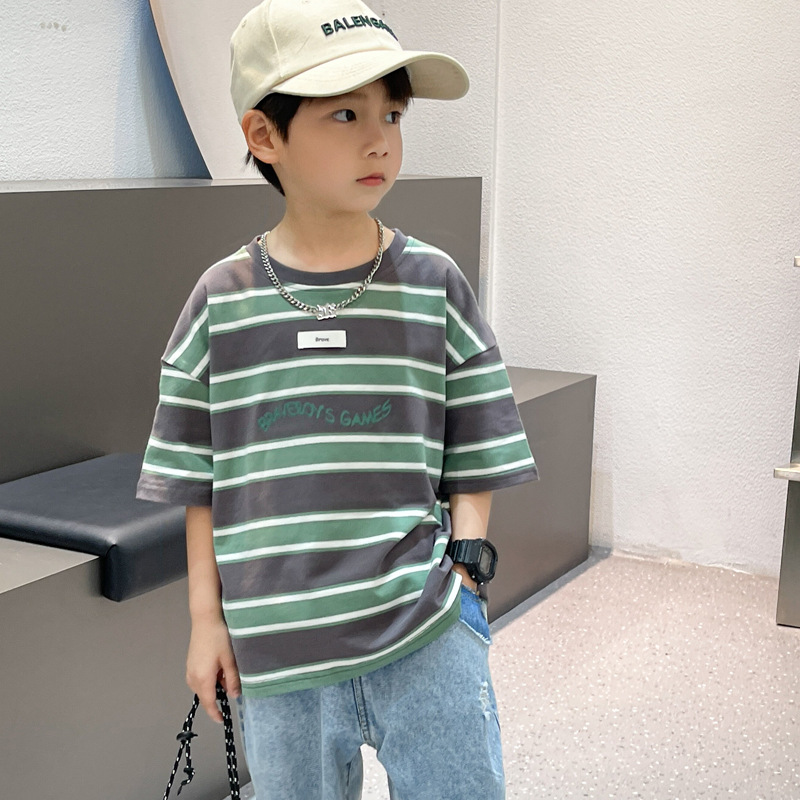 소년 반팔 2025 새로운 어린이 줄무늬 티셔츠 소년 스트리트 탑 중형 및 대형 어린이 순수 코튼 여름 티셔츠 유행스토어 가기