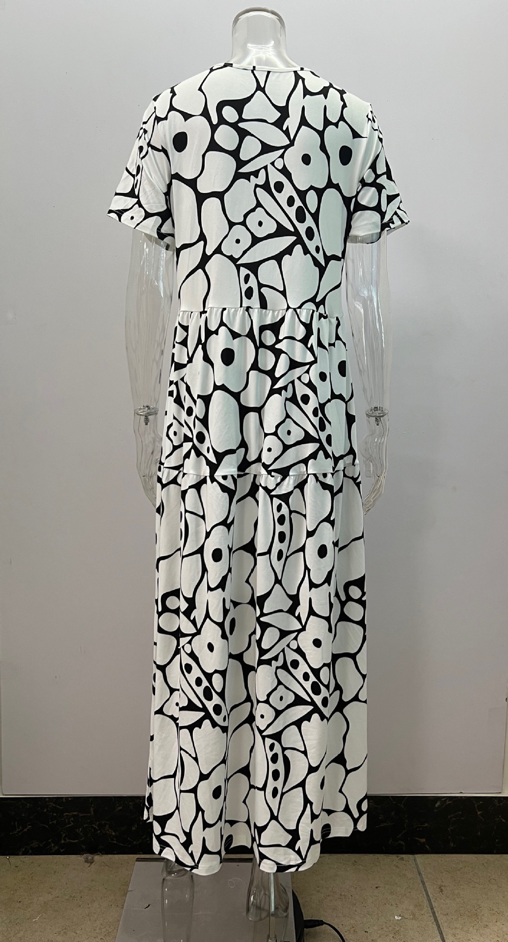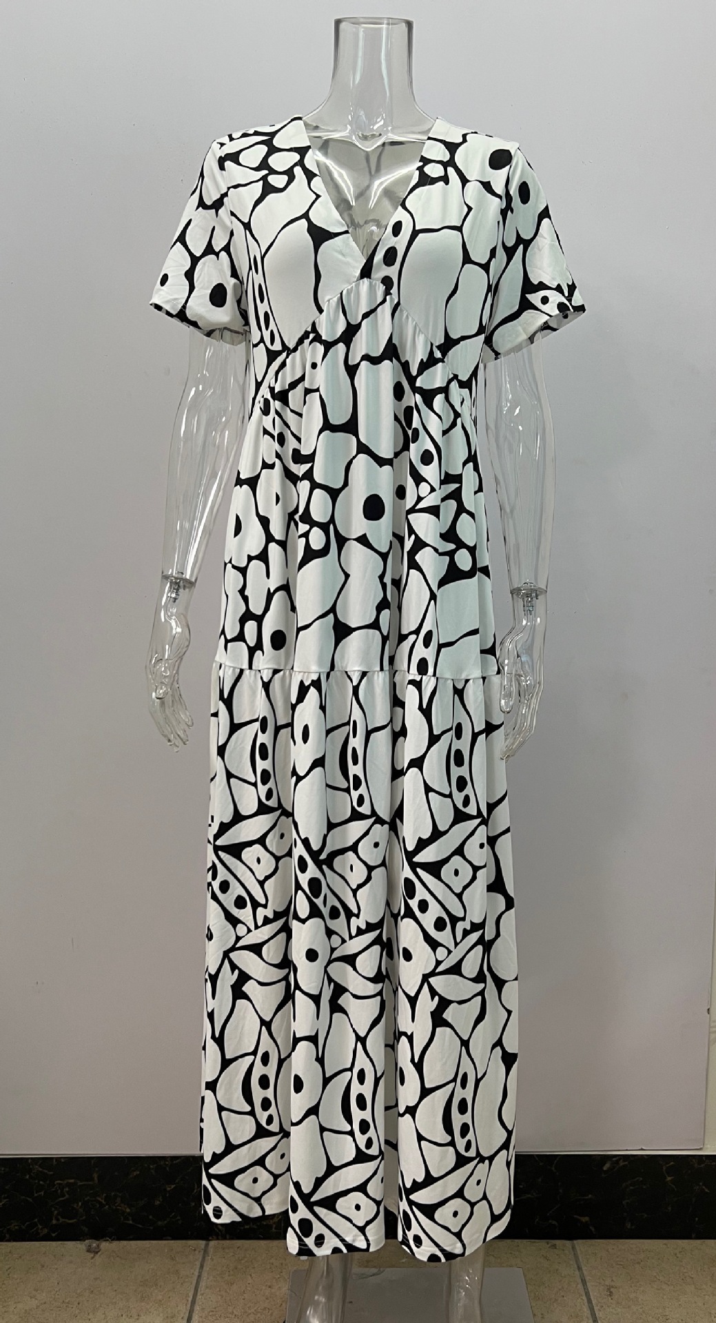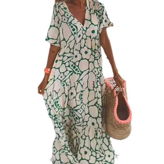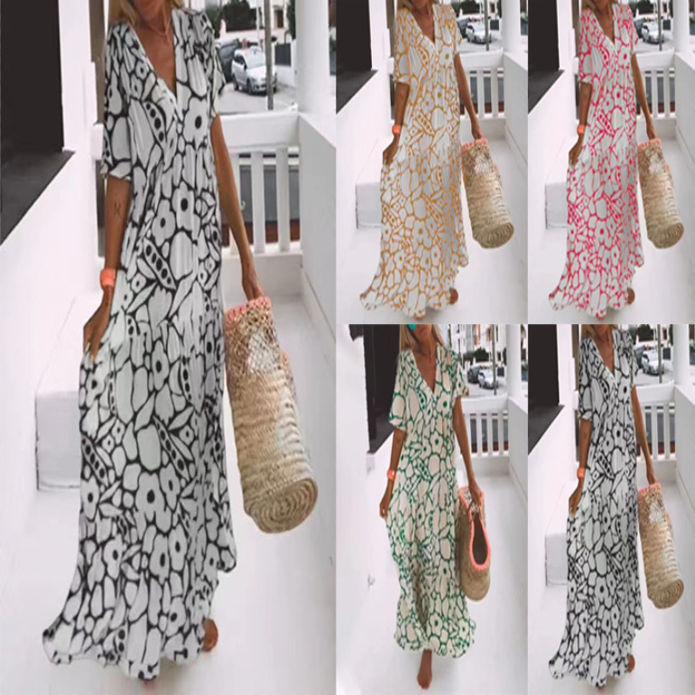 2024 Amazon AliExpress 유럽과 미국 여성의 여름 새로운 인쇄 짧은 소매 깊은 V-목 긴 원피스 여성