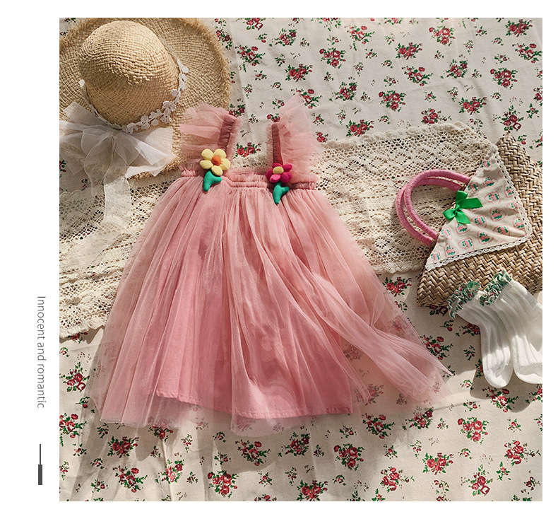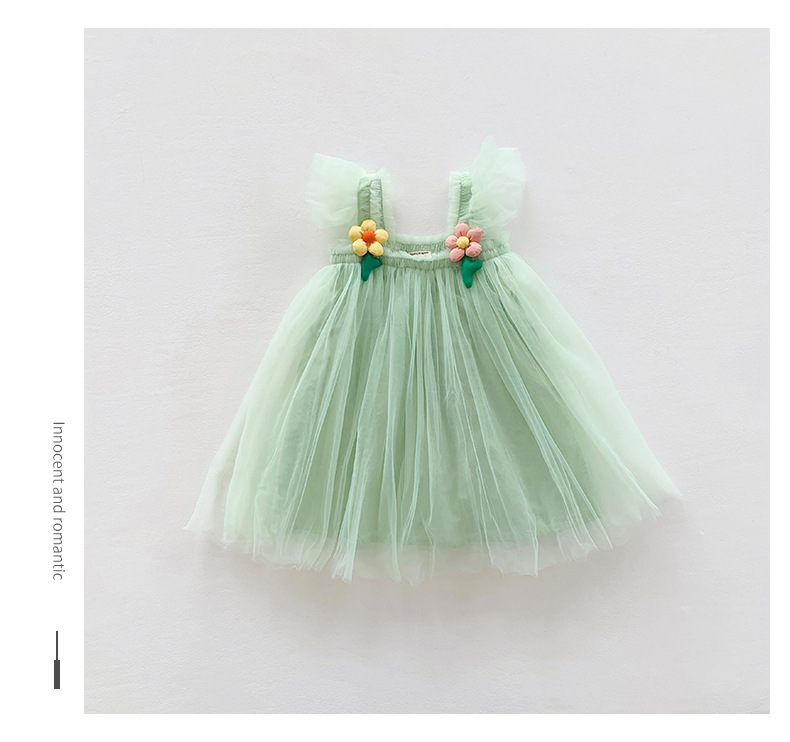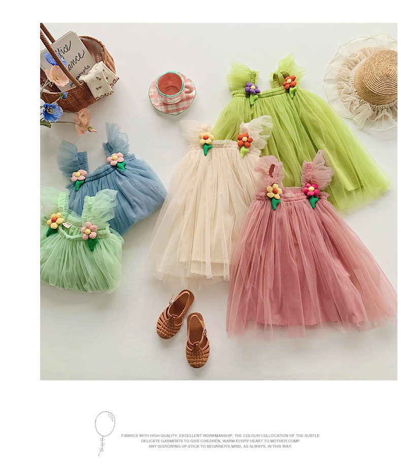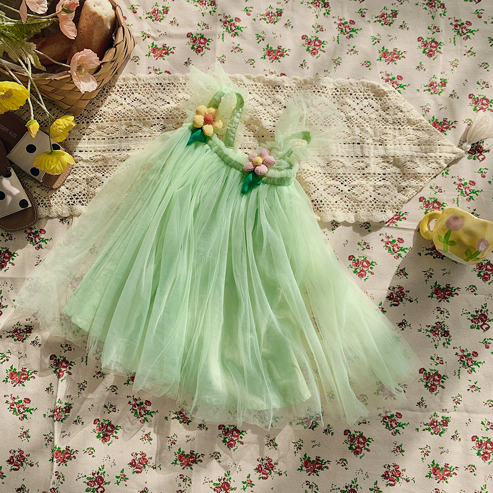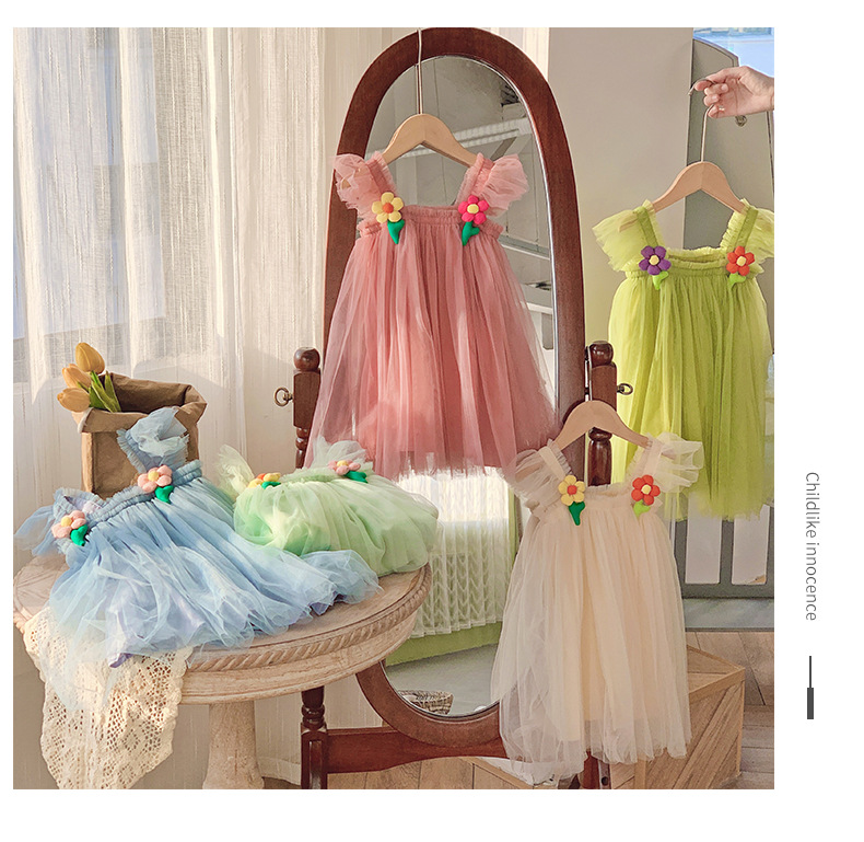 아름다운 입체 꽃망사 여아 드레스 2025 여름 스타일 플라잉 슬리브 여아 퍼프 스커트 공주 드레스