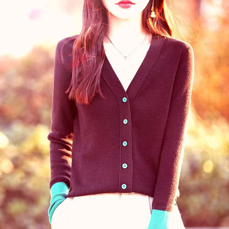 25 봄과 가을 새로운 스타일 여성용 소모사 울 니트 가디건, 느슨한 색상 매칭, 얇은 긴팔 기질 아우터 스웨터 도매스토어 가기
