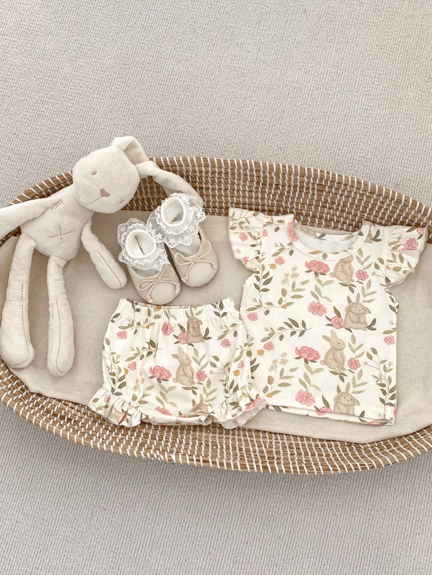 INS 새 아기 소녀 여름 아동 의류 귀여운 토끼 인쇄 플라잉 슬리브 탑 레이스 반바지 소녀 정장