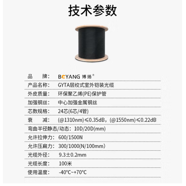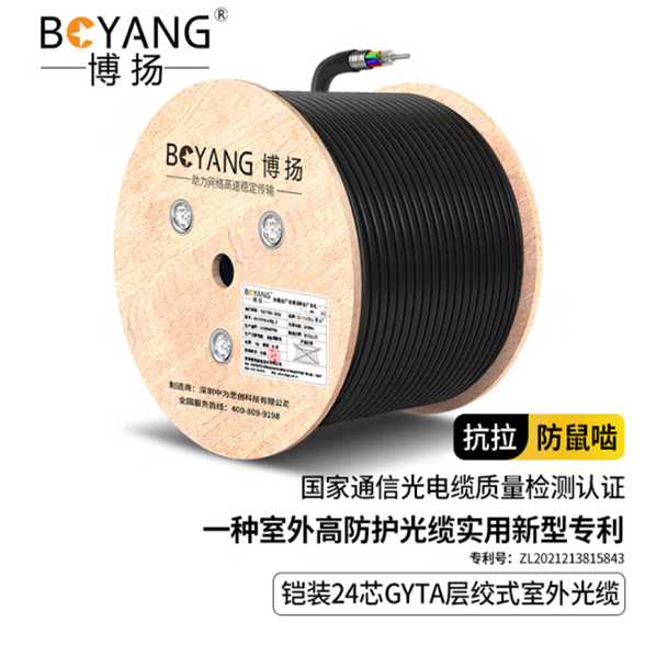 博扬(BOYANG) BY-GYTA-24B1.3 铠装24芯单模室外光缆 GYTA层绞式室外架空/管道光纤线 100米(长度可定制)*1 合格证*1 保修卡*1