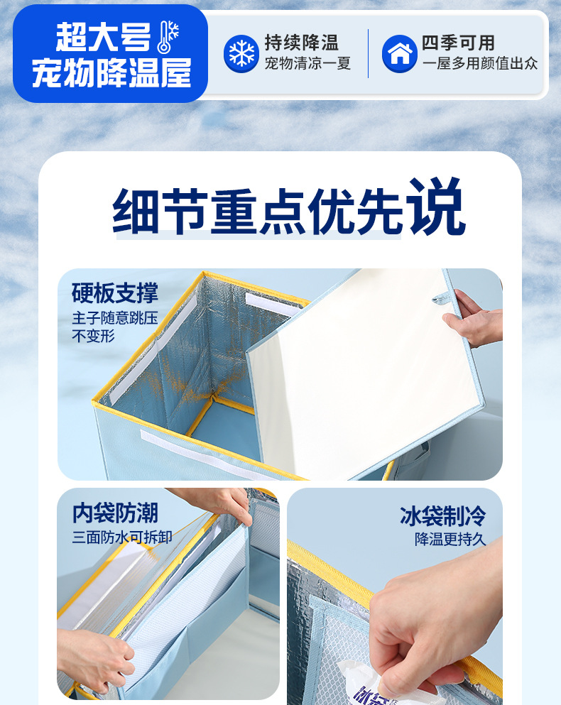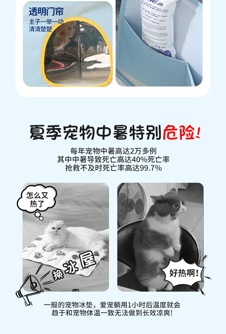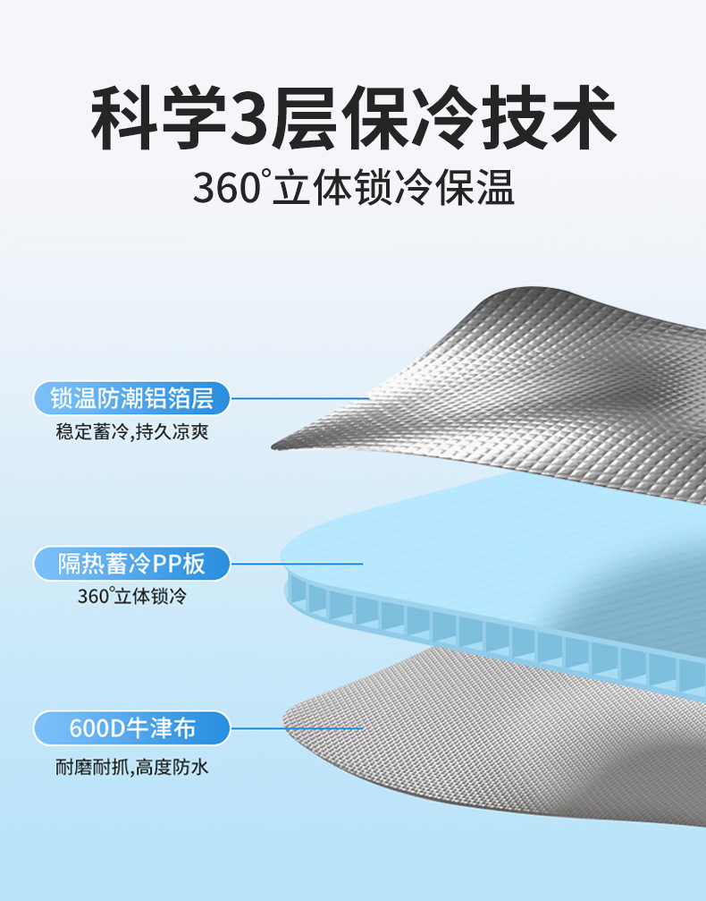 1.三层隔温保护,外层加厚牛津布耐抓耐磨,中间防水立体pp板,内层保温隔热铝膜 自吸水冰袋可维持6-8小时全身降温