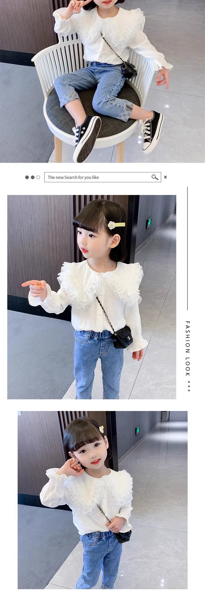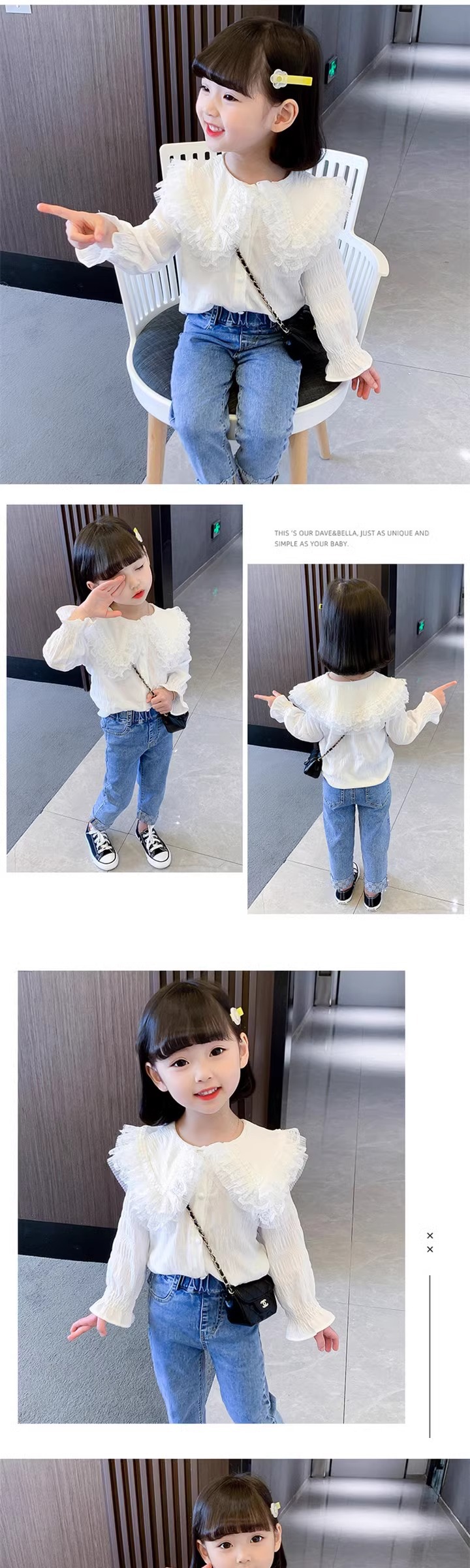 여아용 세련된 흰색 유행 봄 옷 한국 스타일 2024 새로운 옷깃 셔츠 봄과 가을 공주 긴 소매스토어 가기