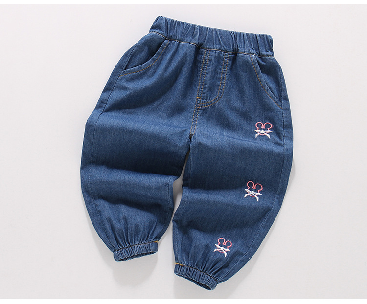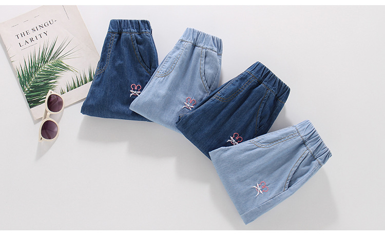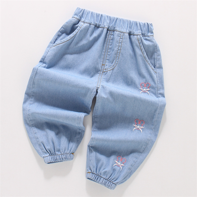 순수한 면화 소녀 바지 얇은 여름 새로운 도착 데님 바지 자수 번들 발 걸스 데님 모기 방지 바지스토어 가기