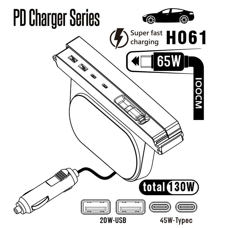 本人2024年最新计,目前仅适用于TESLA焕新款MODEL3,单伸缩线款式,Typec+2个C母座+2个USB-A母座,总功率130W,所有C口都快充,相互独立(同时充电不切5V),Typec伸缩线最高功率支持65W可为笔记本供电。车充点烟头最高功率200W,留有余量,不发烫,本产品外观/结构/电路全部本人新自画图,各位卖家买家有什么的创意或者想法可以帮你实现。