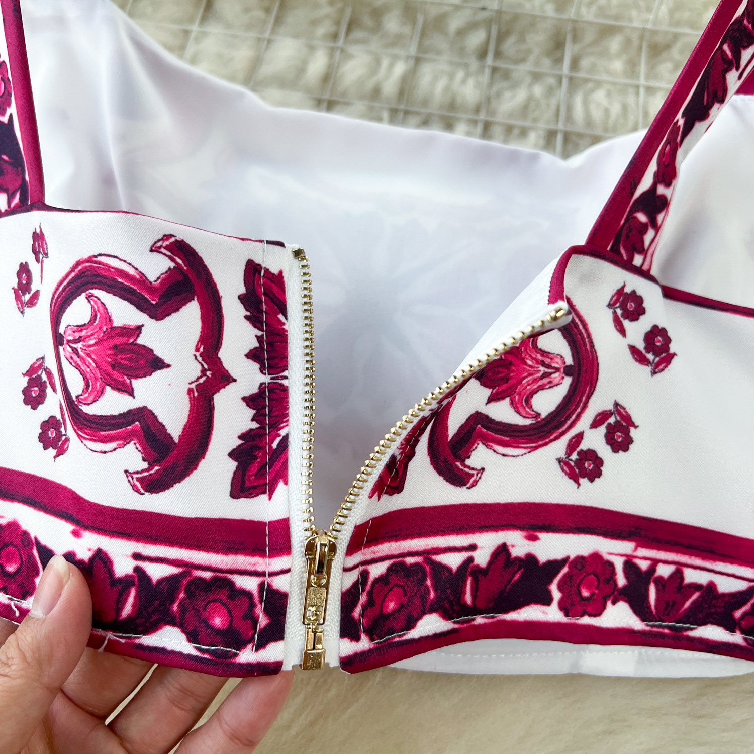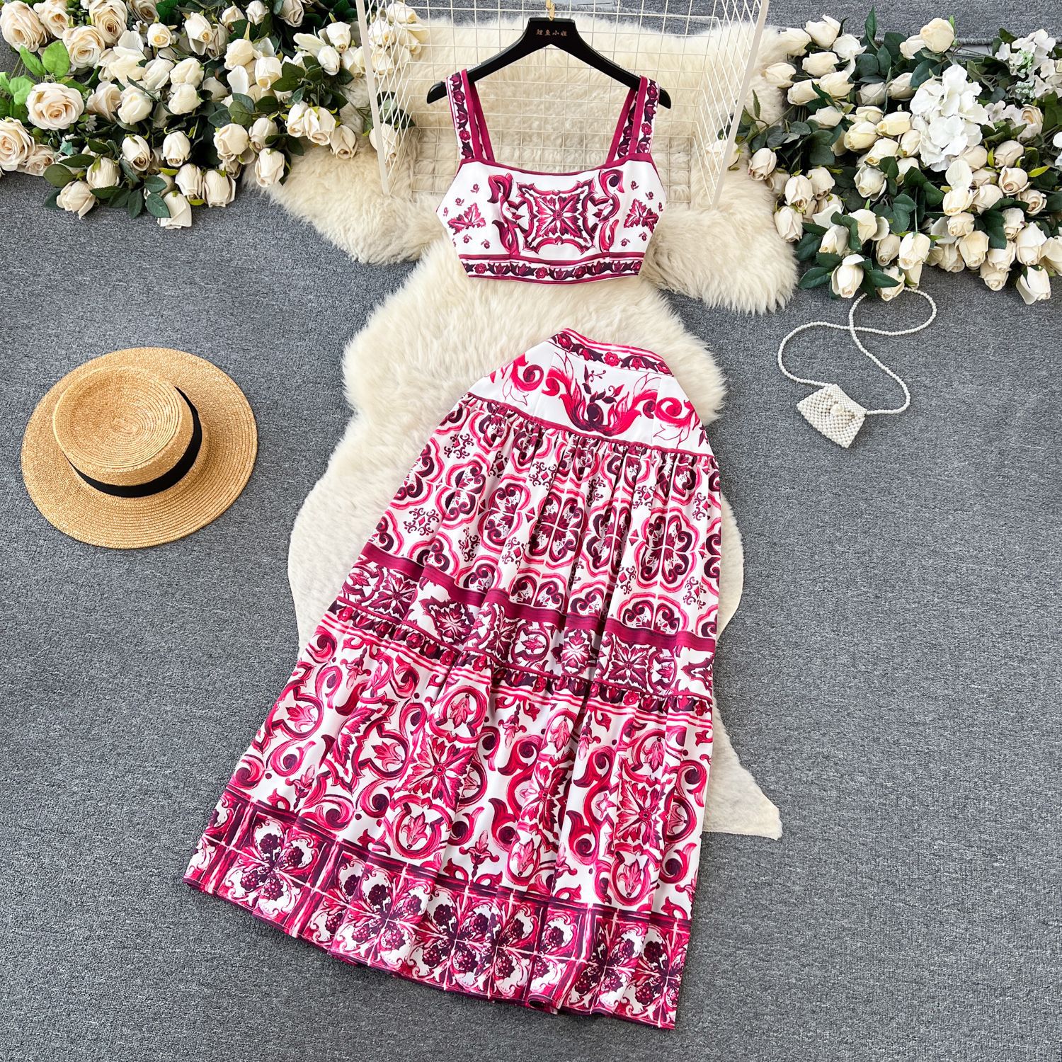 유럽과 미국식 파란색과 흰색 도자기 인쇄 세트 여성의 여름 순수한 노출 된 허리 슬링 작은 조끼 높은 허리 중간 길이 스커트